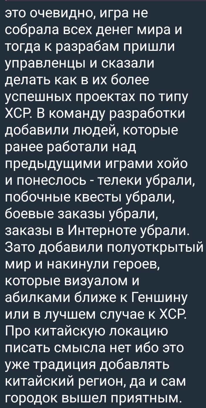 Проблема ззз в том что это ззз - с бредом вместо лора, с изначально неправильной концепцией с релиза, с излишним хайпом на релизе для столь нишевого проекта. Им надо было изначально делать с релиза как в 2.0 с китае-магией, с нейрокалом, с кишками и сундучкамии и возможно получили бы свою долю аудиторий, теперь же со всеми этими ребутами, кокблоками и распилами это проект ни для кого. И никакие айдолы или вх уже не спасут. Это уже никому уже не интересно, на том же твиче у нее онлайн на дне даже в период выхода патчей. Осталось только вх флопнутся, и хойо ее просто закроют, для чего им тянуть этот во всех смыслах убыточный и скандальный проект. Хонкал и геншин еще пока прибыль приносит, они и будут их дойть, а ззз закинут на дно к хонкаю.