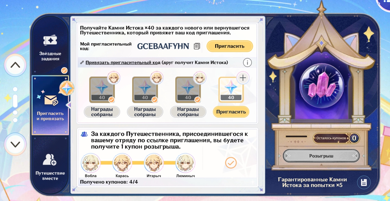 Игровой процесс «Астральный предел» Genshin Impact скоро станет доступен. Присоединяйтесь к моему отряду уже сейчас! Участвуйте в событии, чтобы получить Камни Истока и наряды Манекенов! Пригласительный код: GC40E761QN,https://hoyo.link/8NJvYlbe4?m_code=GC40E761QN