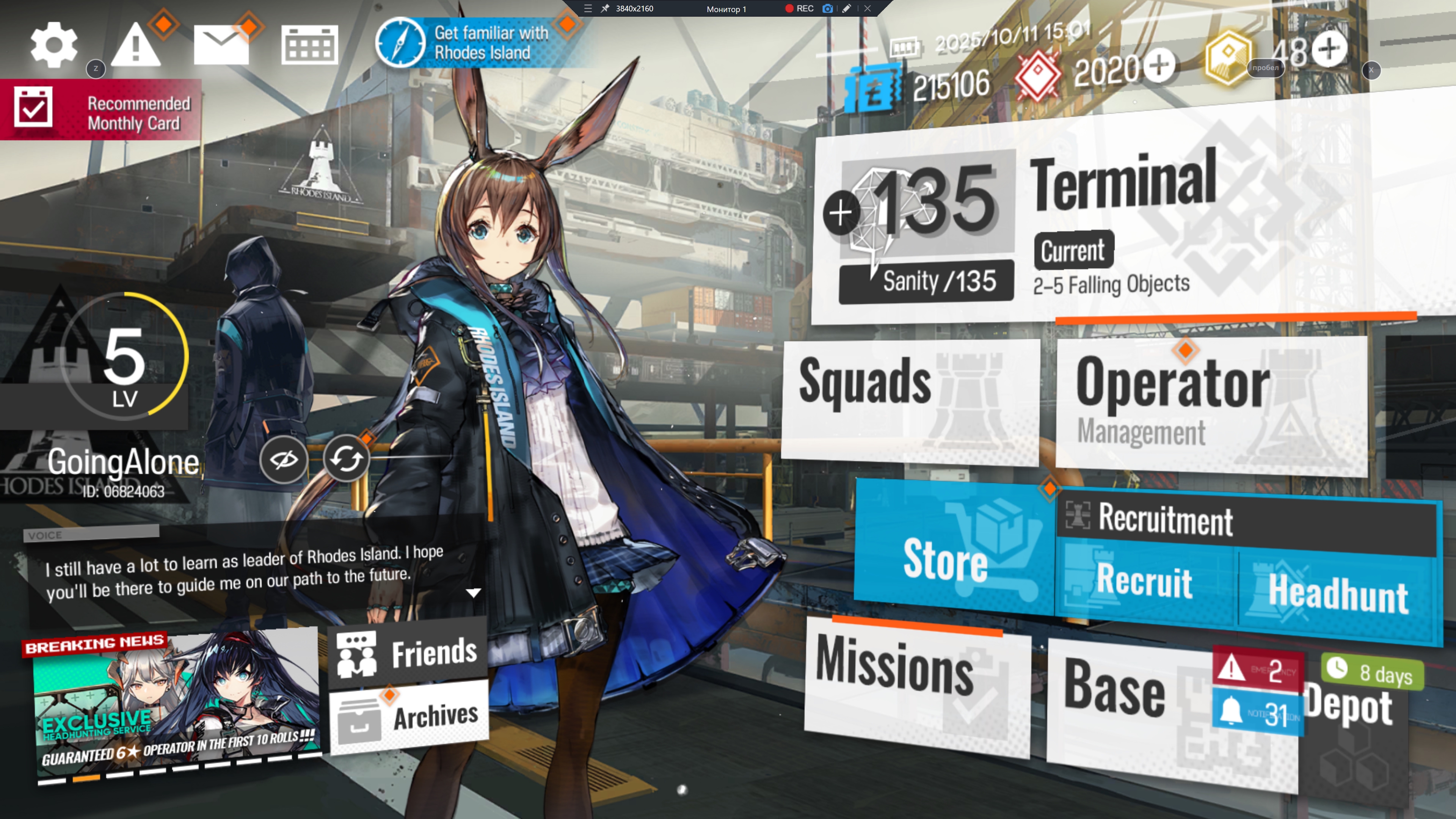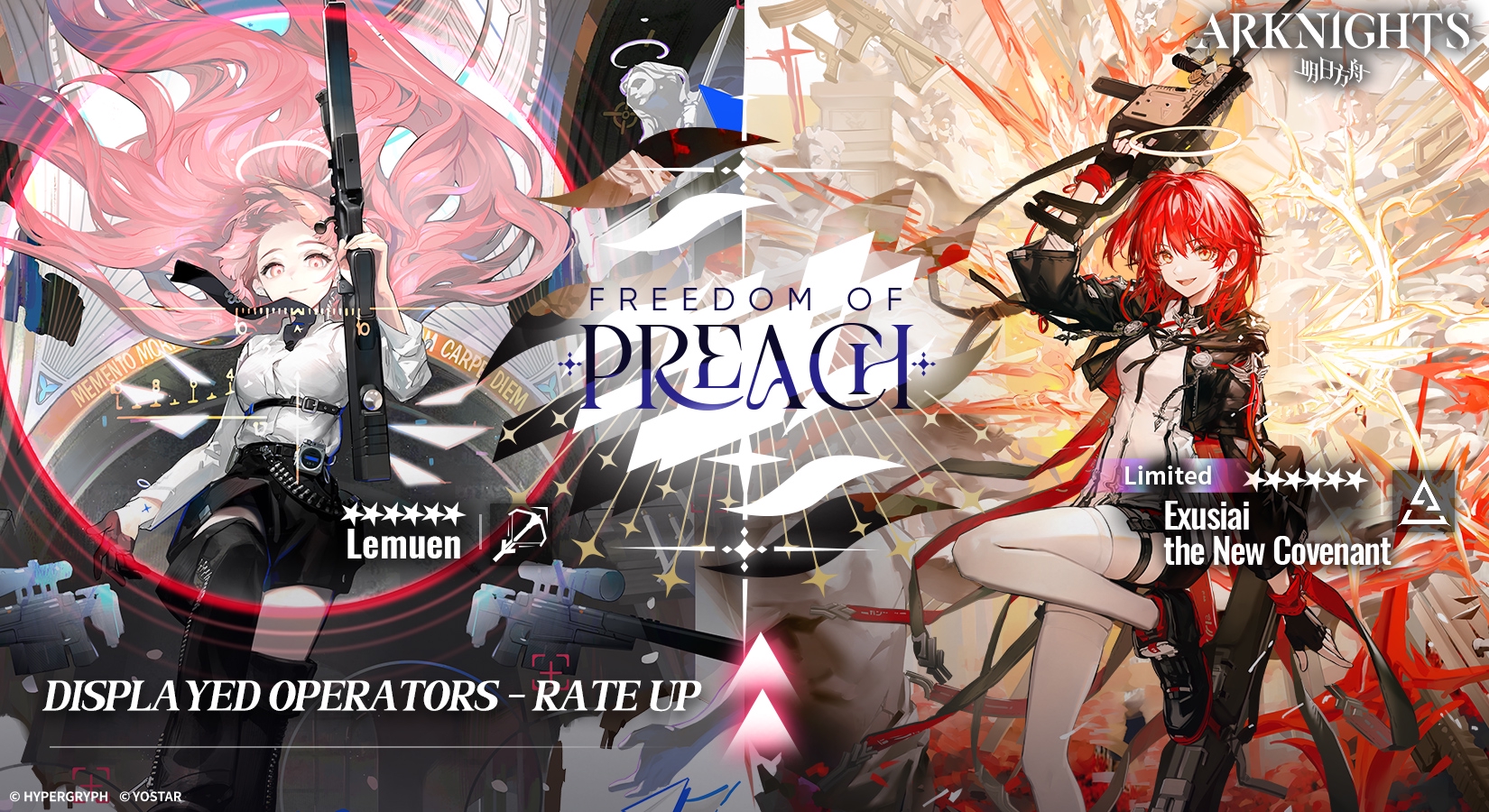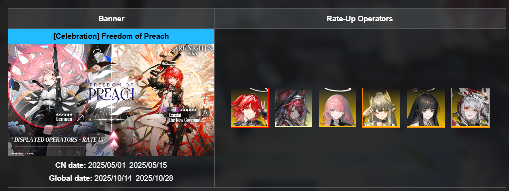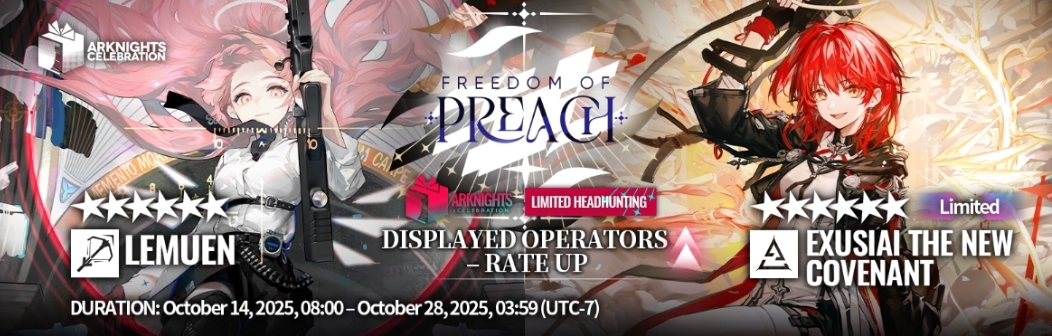 В честь будет запущен специальный баннер с лимитным оперативником Exusiai the New Covenant. 6★ — Exusiai the New Covenant / Lemuen 5★ — Gracebearer (баннер будет с 14.10 по 28.10)