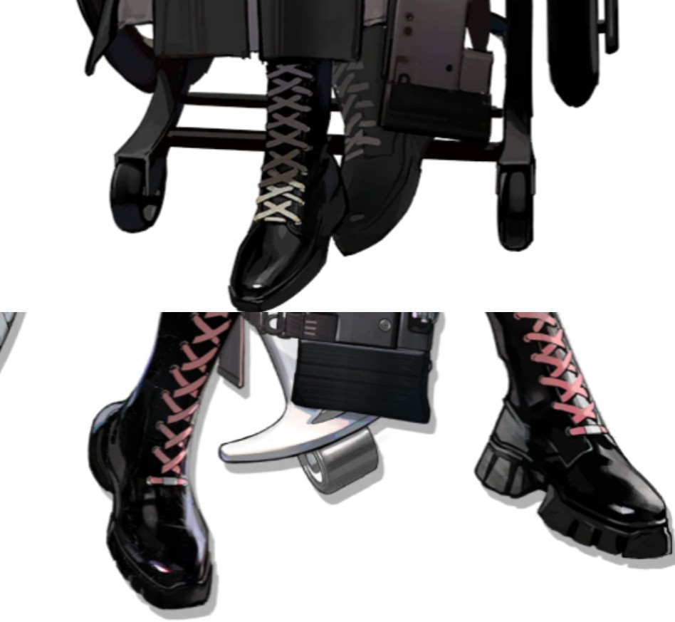 Лол так это не столько ботинки даже сколько стягивающие чулки, чтобы держать хоть немного в тонусе мышцы ног, потому что из-за болезни ей даже вставать нельзя было раньше, но атрофия существует даже на Терре к сожалению. Причём на обеих версиях Терры даже на Терре из Сегментума Солар А тут девушка которая несколько лет вынуждена была лежать либо сидеть максимум