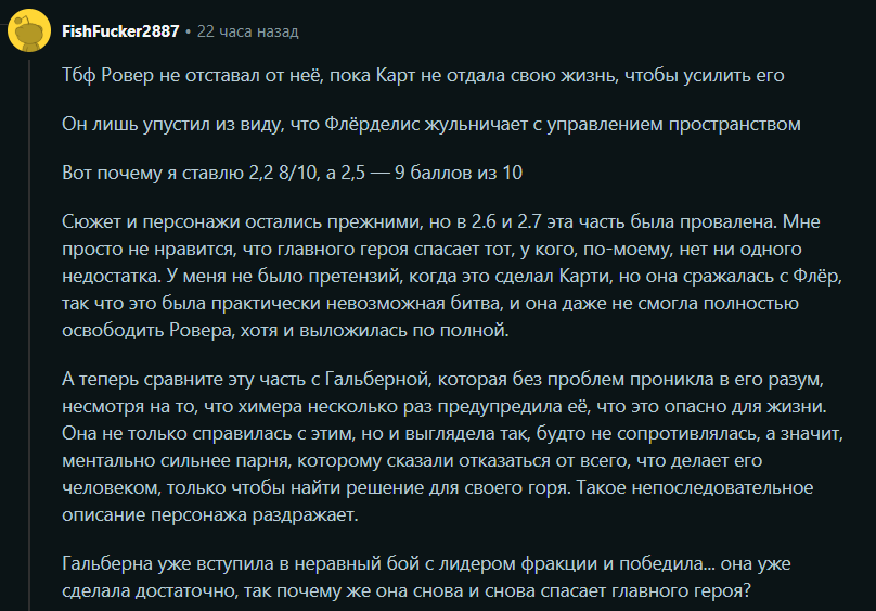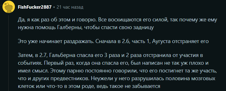 >>5706748 Ну он совершенно прав. Явная проблема дисбаланса. На фоне хайлайтов Гали вы даже не сможете вспомнить, сделал ли что-то Ровер. Сделал ли что-то в принципе? Да, сделал, по-своему важное для сюжета было. Но оно настолько малозаметно, что любое "сделал" от Ровера затмевается её хайлайтами. Самое обидное, что Курычи уже показывали, как делать правильно. Патч 2.0, 2.2, 2.5. Везде отличный баланс и раскрытие, не оттеняя главного героя. Там все "сияли" вместе. И в этом было преимущество подхода. 2.7 же абсолютно неоправданно делает обратное. И тут я склонен согласиться что раз спасание — никаких проблем, его и Катя выручала, и в 2.0 Карлотта с Брантом и Роччей, но когда это начинается повторяться раз за разом, раз за разом, два, три, четыре, пять от одного персонажа за один акт: уже просто раздражает. Почему в собственном майндскейпе Роверу опять понадобилось, чтобы его спасала Галбрена? Почему он сам сразу не увидел лжеФенрико, хотя знает истину и где тот находится? инб4: ррряя ты просто ляобото не понял ахуй!