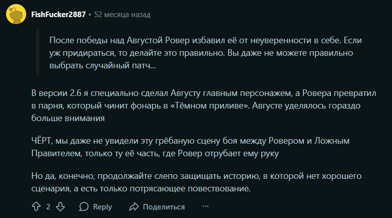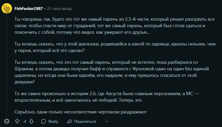 А вот и проснулись процессоры и все продолжают втирать нафталиновую мазь в свою ссаднящую жепу. Ой, вот 2.2 был пик синемой, ведь там был диснеевский замок из кубов и картошечка... Ой, а вот в 2.4 была лупочка... А в 2.5 моя любимая флопова... Ало, дэбсы, любители пожалейного кала, клуб любителей ромновелл находится не здесь, у нас тут сёнен про то, как дух человечества превозмогает апокалипсис, дил виз ит.