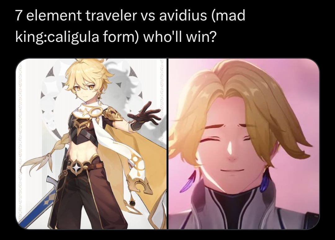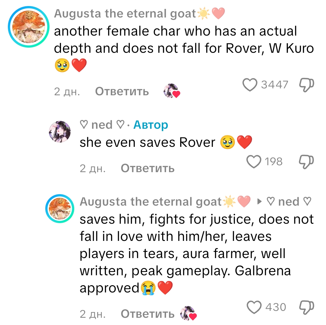 Малые, я тут понял, что галбрена - это же буквально ровер, только лучше его во всем. Следите за руками: - они оба путешествуют по миру, борясь с ламентом, только у нее уже куча фрагов, сделанных в соло, а ровер кое-как вывозит с помощью кучи подсосов - они оба оставили свою прошлую жизнь позади, но если галя сделала из-за трагедии, которая сделала ее опасной для окружающих, то ровер просто словил грусняшку и вайпнул себе память, после убежал как омежка - у них обоих есть компаньон, но если у галбрена это крутой тд со своими собственными взглядами и философией и у них действительно интересные и сложные отношения, то у ровера - это мохнатая прожорливая паймон, о которой он ничего не знает и потому отношений кроме как "мы едим вместе" у них нет - они оба превозмогают, но если галя превозмогает собственное проклятие, покорив его и обратив себе на службу, то ровер превозмогает собственную амнезию, которую он по своей тупости сделал сам Галя - это типичный антигерой с тяжелой судьбой, золотым сердцем и крутым дизайном, еще и с чувством юмора. Ровер - это типичный гг гач, с унылым дизайном, просто плывущий по течению, шутить не умеет. Короче говоря, я считаю, что Писевору нужно сделать ее главным героем вувы, от этого все только выиграют. Нужно составить петицию и написать всем тредом, что думаете?