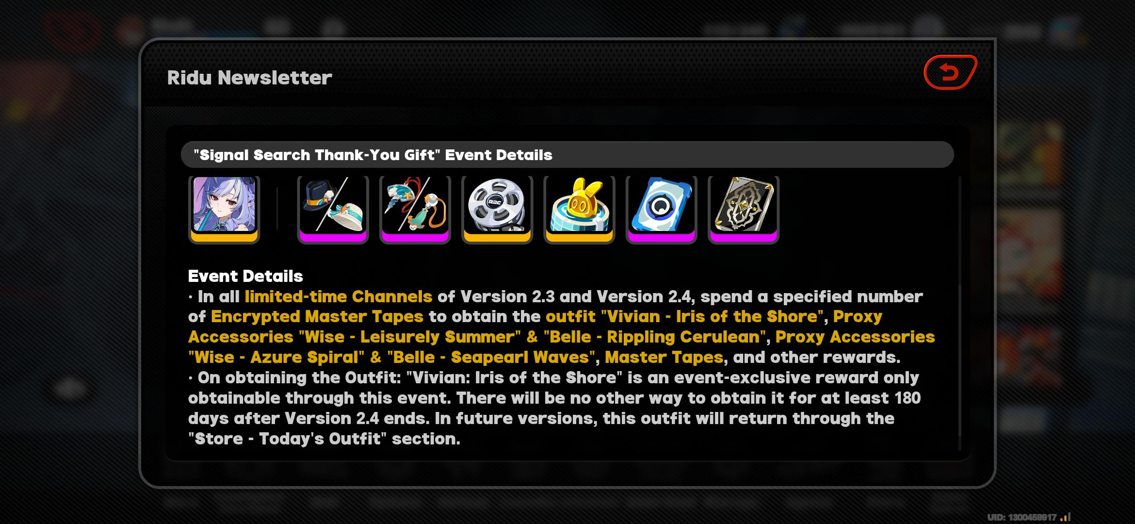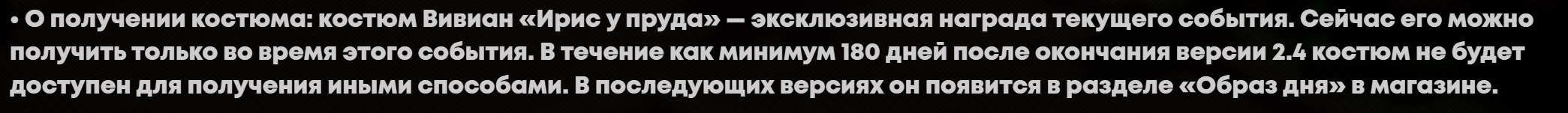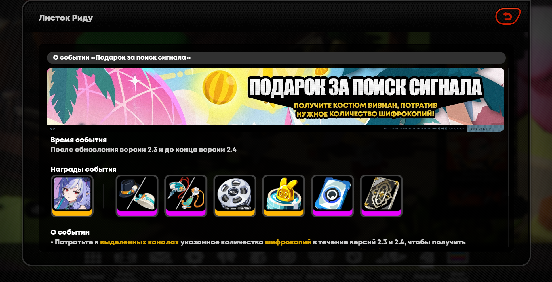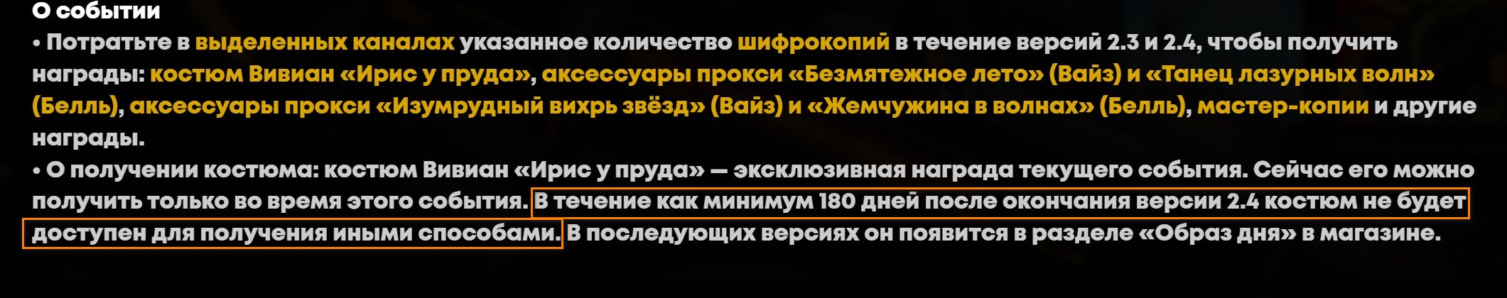 Время события: После обновления версии 2.3 и до конца версии 2.4. О событии: • Потратьте в выделенных каналах указанное количество шифрокопий в течение версий 2.3 и 2.4, чтобы получить награды: костюм Вивиан «Ирис у пруда», аксессуары прокси «Безмятежное лето» (Вайз) и «Танец лазурных волн» (Белль), аксессуары прокси «Изумрудный вихрь звёзд» (Вайз) и «Жемчужина в волнах» (Белль), мастер-копии и другие награды. • О получении костюма: костюм Вивиан «Ирис у пруда» — эксклюзивная награда текущего события. Сейчас его можно получить только во время этого события. В течение как минимум 180 дней после окончания версии 2.4 костюм не будет доступен для получения иными способами. В последующих версиях он появится в разделе «Образ дня» в магазине. Ебала "куплю в 2.5 за монохромы" представили?