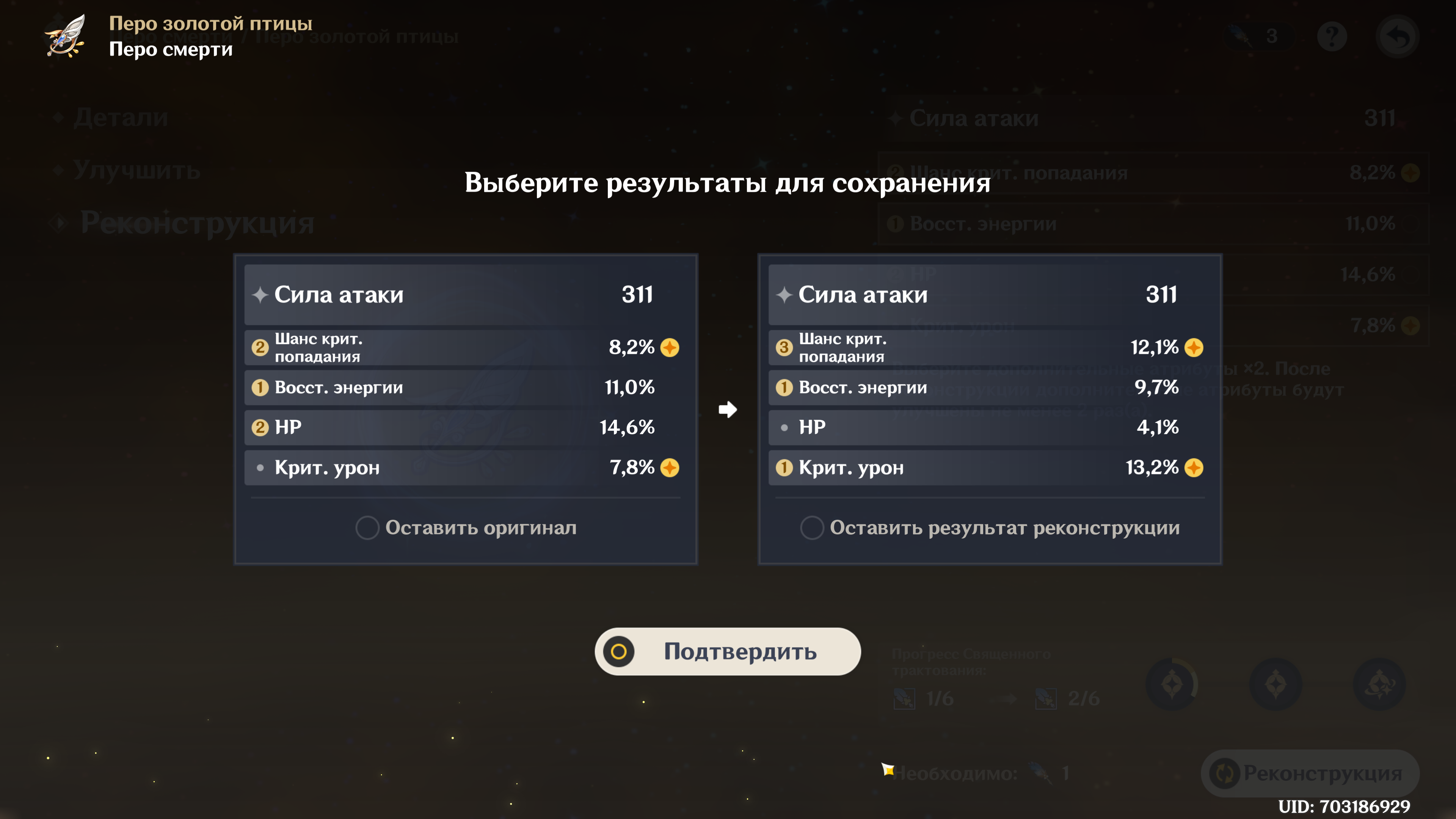 Вот с одной стороны аж плюс треть дамага для Кирюши. А с другой нафиг это надо? 6ю все равно не осилить тк нет 6-9 с2 актуальных персов, 5ю и так проходит. Бездна вообще изи. Театр лучше с0 персов несколько. Ляо сас своими кокблоками убивает желание крутить консты даже новым персам Короче надо терпеть до флипа на баннере Нефер и надеятся на вин