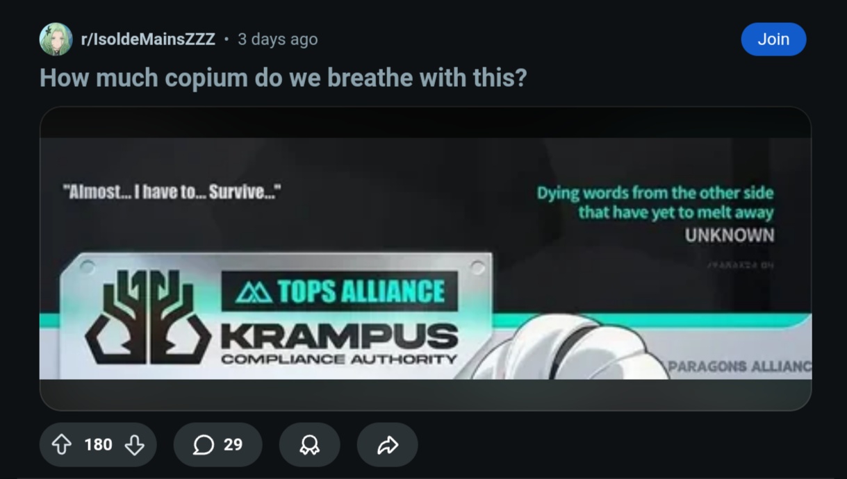 >Её не просто так заанонсили прям вместе с Крампусом в одном тизере. Это не был тизер Крампуса, это был тизер сюжета. Фракцию Крампуса в тизере действительно показали, но там они стоят втроём, без Шуньгуан. В этом же тизере показали и Йидхари с Люсией, но ты ведь их в Крампус не записываешь? И таки да, Шуньгуан показывают только в самом конце, отдельно от всех. Судя по тому, что Шуньгуан выходит не в следующей версии (которой тизер посвящён), а только, надо полагать, в 2.5 — это заблаговременный прогрев на войдхантера.