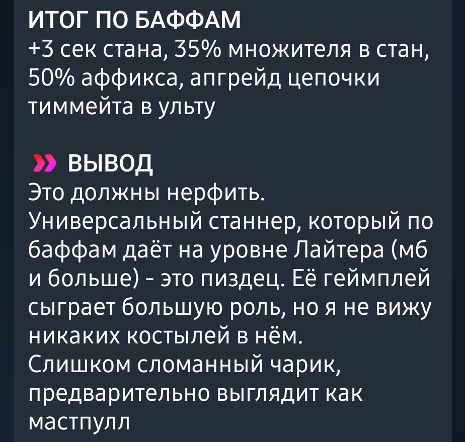 Ну я говорил, что для поднятия имиджа станнеров нужно будет релизнуть станнера, который наконец-то не брик. Другое дело, что это окончательно заколачивает аномалистов в гроб, да и вот эти новые дабл атакеры тоже теперь не нужны. Короче как обычно, слабые персонажи стали еще слабее, сильные еще сильнее. Крутите филеры, зюзята, целых пол патча дадут поиграть.