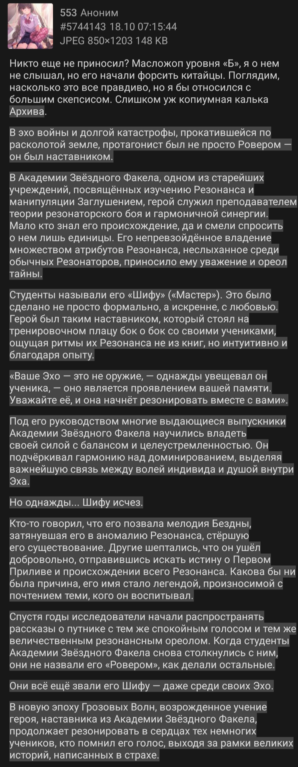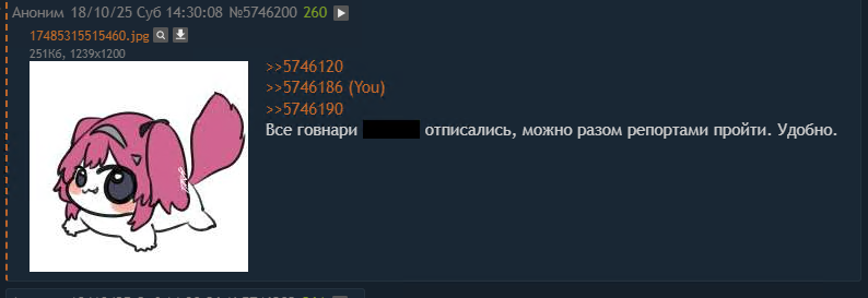 Если в треде появился человек, что использует слово "темняша", то скоро начнутся набросы на мровера с "узбеком". Если в треде появился человек, что использует аватарку Зани - то начнутся набросы на других персов/игру. Подтверждается из треда в тред.