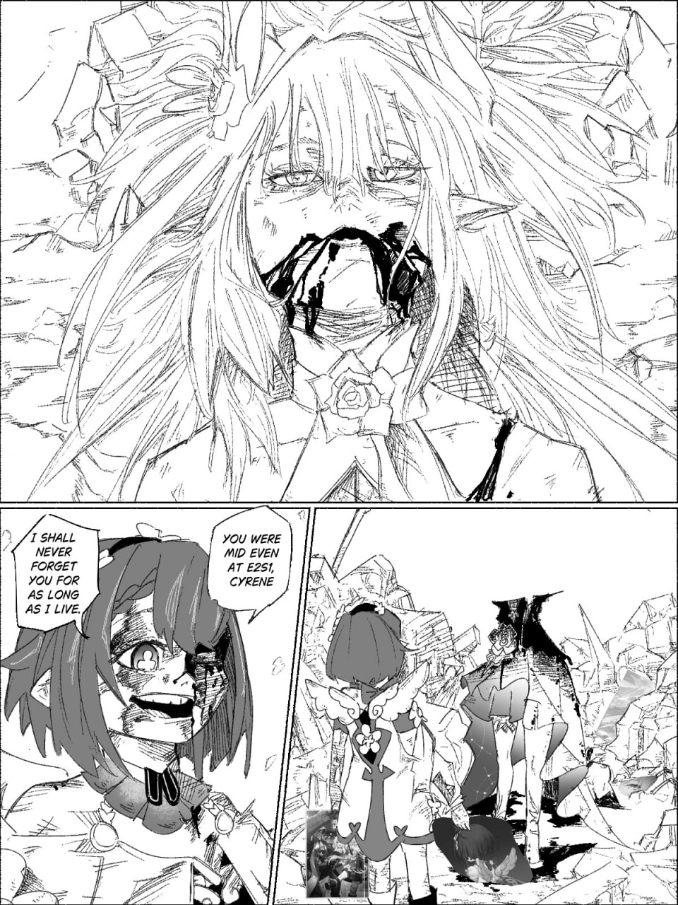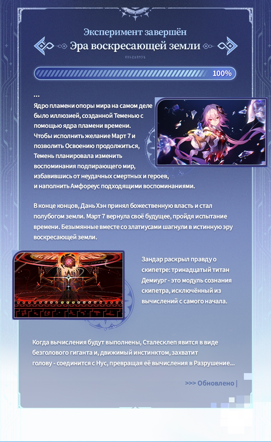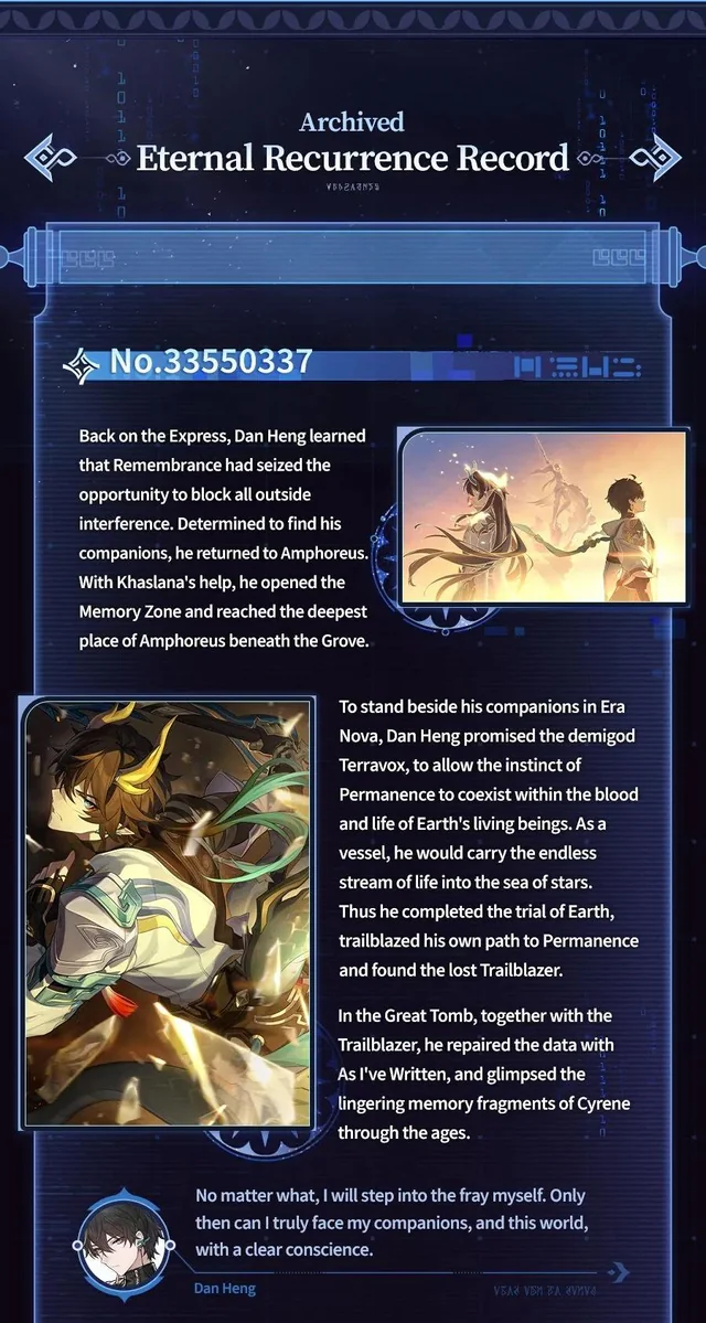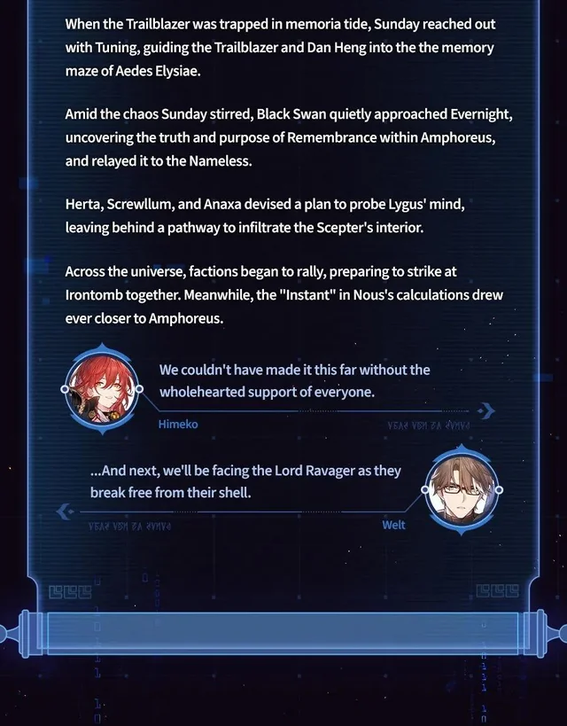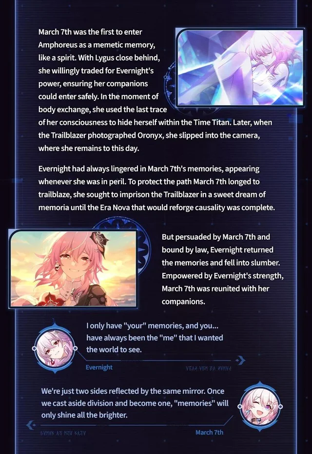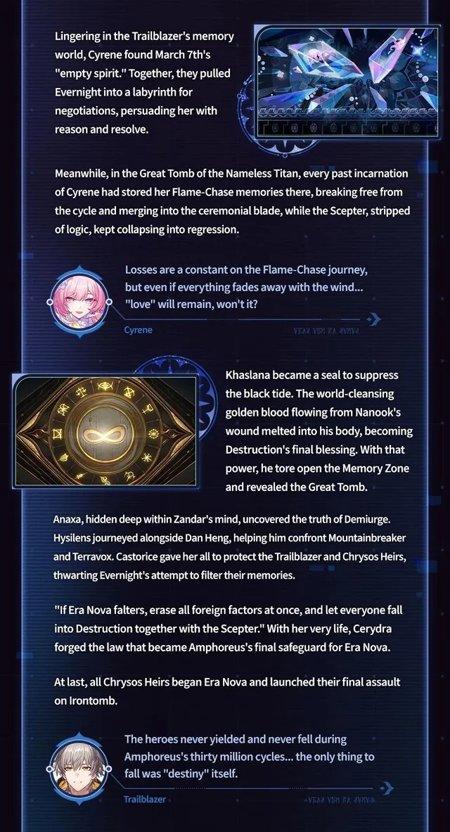 >>5756413 "Evernight": But fortunately, that girl's sacrifices won't be wasted. I will give her another possibility. "Evernight": I promised (Trailblazer) that I would re-create the cause and effect of this world, and form a flawless Amphoreus. "Evernight": But the only way for a world that can't be turned back to be considered "flawless"... "Evernight": Is to burn it with a raging fire until nothing remains. Black Swan: You plan to... destroy all the "memories" Cyrene has ever recorded? "Evernight": That's right. I'll set fire to all the stories, all the emotions, all the futility... I'll turn the Garden's conspiracy to dust. "Evernight": Setting fire to this much material will be enough to completely annihilate the Scepter's operating logic. Irontomb will lose the soil upon which it grows, and Amphoreus... will be truly set free. Black Swan: The "freedom" you speak of is no different from Destruction. Everything this world ever was will disappear from the extrapolations, never to be regained.