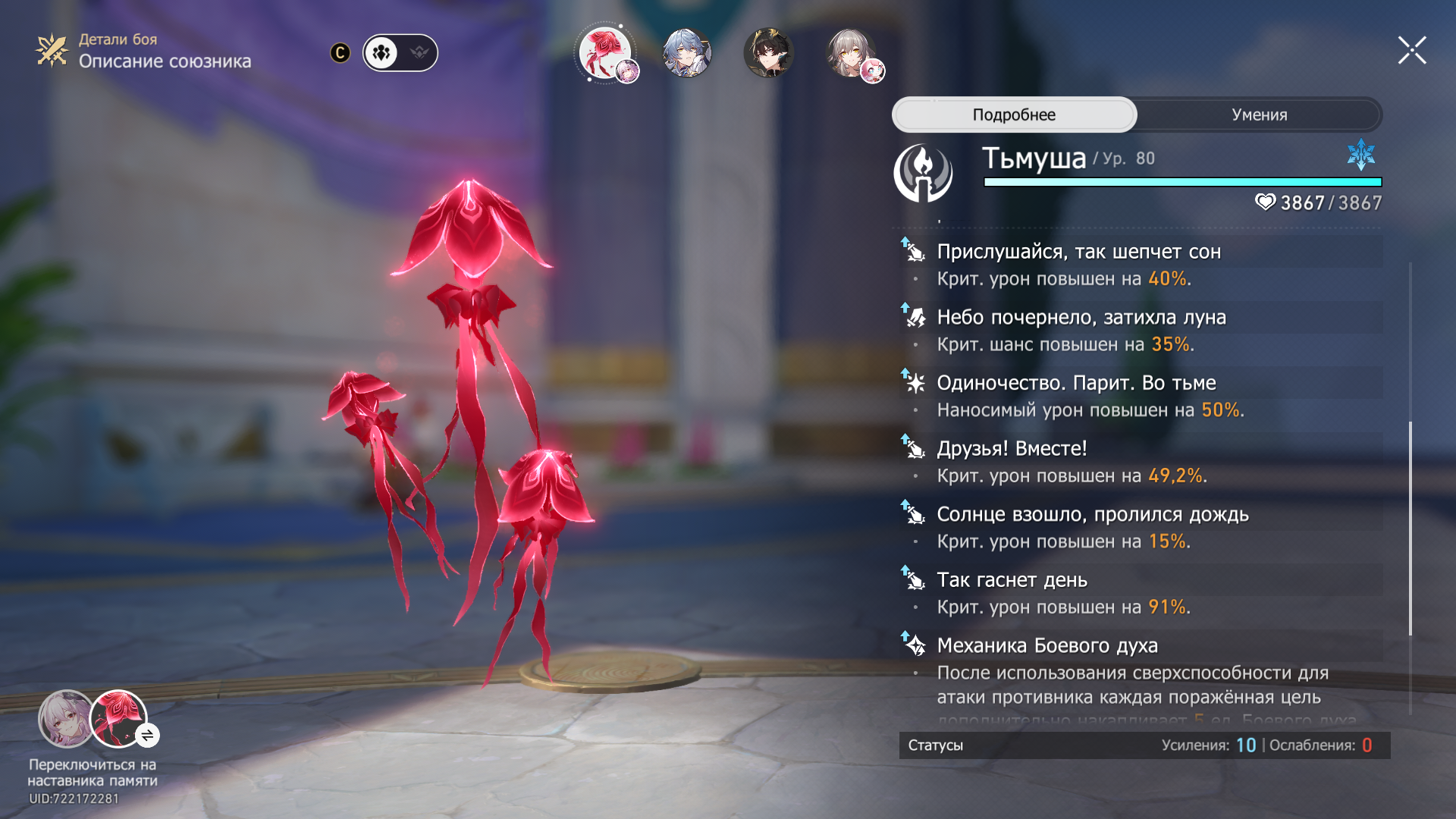 Допустим услованая Перламутр дичайше баффает урон, но красит его в иной элем. И пук. Увы. 120 ледяного резпена какой-нибудь Кирены моментально в помойку отлетают. Хотя конечно вне Памяти ей делать всё равно нечего.