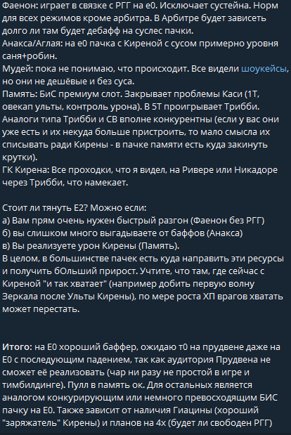 Бтв, уверен высер "В 5Т проигрывает Трибби" сделан на основании сравнения с Е1 Трибби, а не Е0. Как и в случае Анаксы и Аглаи он в голове держит минимум Е1 Зарянку, а то и Е1 Саню. Он сам привык играть на констах.