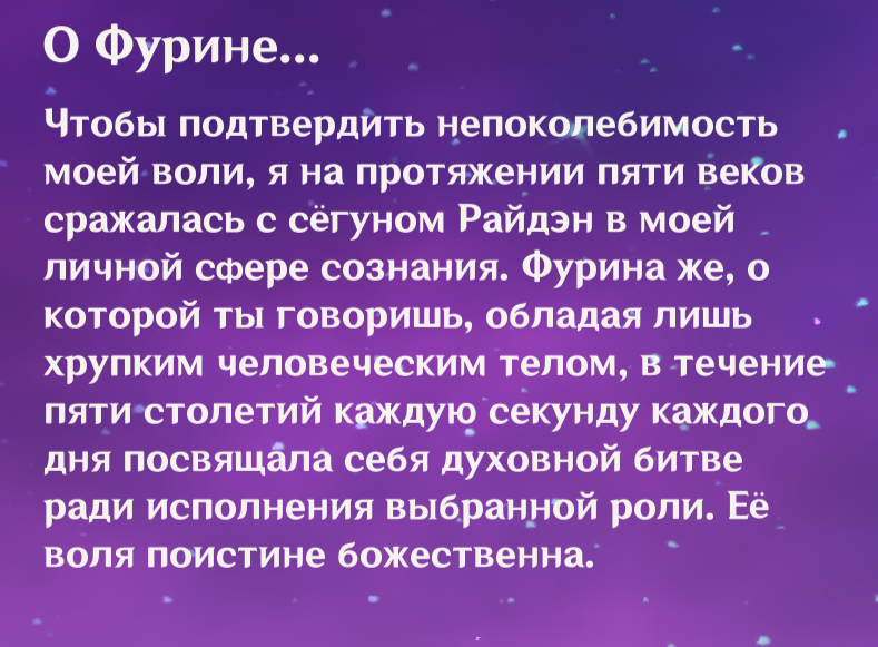>>5756581 Сёгун это автономный йоба-киборг в котороми сидит меч в котором сидит архонт. Фурина человек, это чёрным по белому сказано в самом сюжете. Причём лабораторными испытаниями апрувнуто.