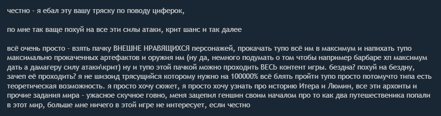 Нормальные ребята утром заходят в игру, делают дейлики, каточку в геншин-доту, каточку в геншин-кс, а вечером с тредовичками в геншин-оверкукед. Между этим крутят и крафтят новые элементы одежды, чтобы создать своего уникального и прекрасного манекена, чтобы запостить его в тред и получить общий респект за творчество.