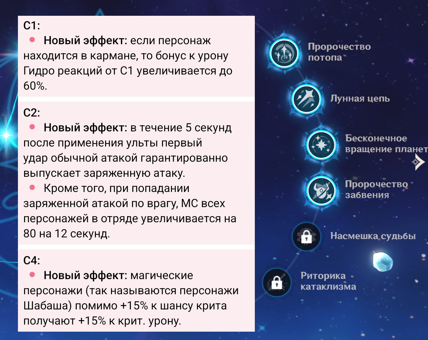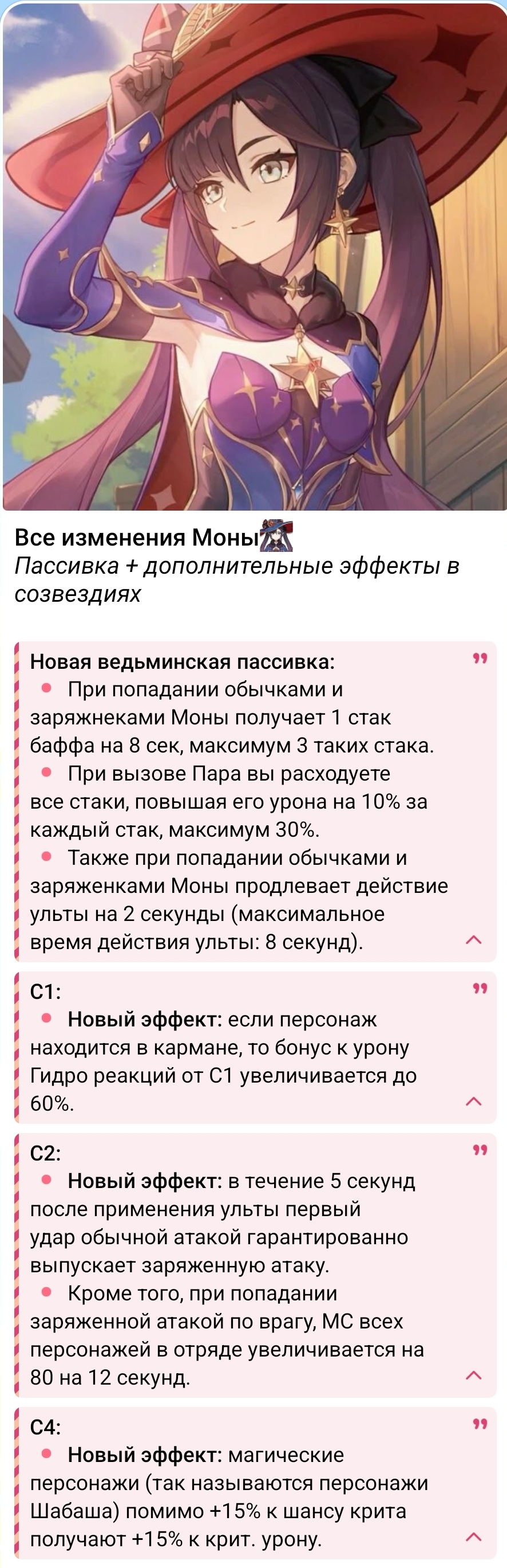 Эта Мегистус какой-то оч сильной кажется. Если она ДД, то у нас: Омен длится 13 секунд, то есть всю ротацию. Омен это 84% дамага. Первые пять секунд после Омена Мона ебошит 30к-35к с руки без учета реакций со скоростью пулемета. А так же раздает 80МС всей пати включая себя. Пассивно бустится на 15% кш и ку, так же бустит всех шабашевцев, ту же Фишль.