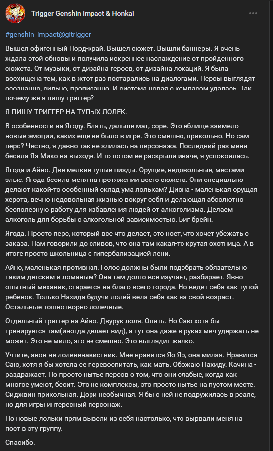вся проблема фонтейна в том что ляо проебался с подачей сюжета. он пытался "натянуть тетеву" в первых патчах и сделал резкую развязку нескольких арок сюжета, с кораблём меропидским, с первозданным морем сюжет которого был переплетён с квестом нарциссенкрейца , с аркой пророчества и аркой личных переживаний фурины и точки зрения самого навилета. ну и по итогу сделав такой клубок, арка меропида оказалась слабой, кринжовый кораблик с 3мя лодочками, которые выловили 6 человечков выглядели жалко. квест нарциссенкрейца он не смог нормально подать и вышла ерунда. иначе говоря ляо обосрался с подачей, а еще помятуя что первый ивент был про мальчика который утонул и его бедную маму двинувшую крышей, там была череда пожалеек , которые нарастили некоторую толерантность к пожалейкам и по итогу стратегия ляо по подаче сюжета оказалась слабой, он не смог точно удержать внимание на нужных деталях и эмоциях, в результате вышло хуёво.
