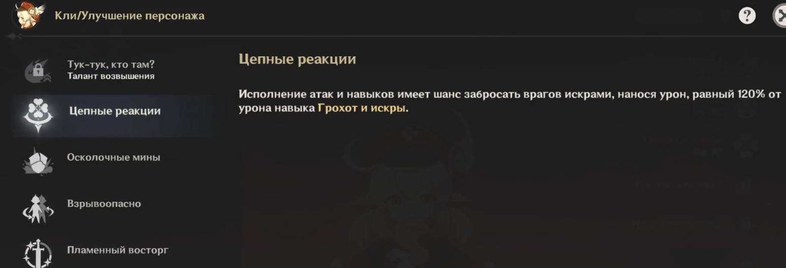 • 🔥 • Кли Когда элементальный навык, взрыв стихии или обычная атака Кли попадает по врагу, она получает 1 уровень «Бум-усиления» (каждый существует отдельно 20 секунд). Если у Кли есть 1/2/3 уровня «Бум-усиления», заряженная атака, усиленная Искрой взрыва, наносит 115% / 130% / 150% от исходного урона.