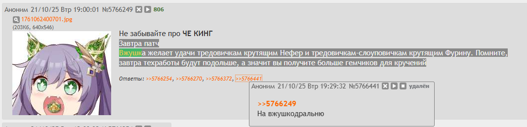Вчера на улицу выхожу на хлебом, у подъезда бабка сидит. Спрашиваю "бабка бабка, че ждешь? на улице холодно, домой пиздуй", она грит "внучок, заебалася дома сидеть трястися! сток часов ещё баннер с Нефер ждать! вот вышла пропердеться" В магазин иду в Пятёрочку, на кассе бомж в очереди стоит, чувствую в бок меня чем-то твёрдым тыкает, говорю "мужик, заебал, че надо? ща ментов вызову", а он "бляя брат, яааа ээто добавь чирик, н-нее хватает бля на чекушку, а завтра баннер с Нефачкой" Бля, ну добавил, че во мне, людского чтоли мало? Домой иду, там мимо меня две паймоны проходят, одна говорит "сис, сколько на Дуринчика уже накопила?" а другая ей "я нео паймона сис, я буду крутить Нефер" и как НАААА НАХУЙ ей с вертухи с разворота, аж куски биг тейсти по всем сторонам полетели Ух бля, короче патч будет что надо, Нефер то все крутить будут, у нас же не тред пидорков каких-то