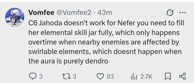 Фурина не работает с лунар реакциями А Айно работает, мастери заливает, кулдауны удобные, бафает лунные реакции, носит инструктор или сет нодкрая дающий тоже мс в пачку Даёт лунный резонанс, поэтому много даёт для кирила и нефер из за этого