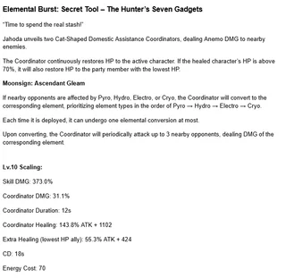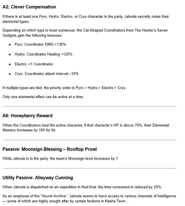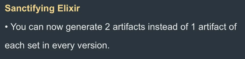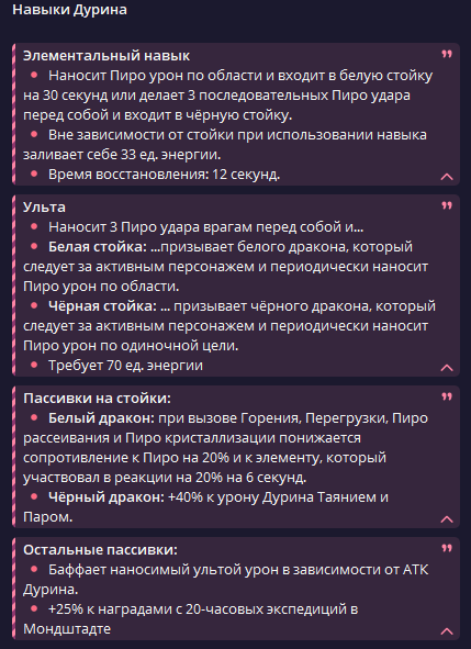 • 🌭 • Альбедо В течение 20 секунд после применения элементального навыка, при нанесении урона навыком по врагам Альбедо создаёт рядом с ними Возвышенное Серебро, существующее 10 секунд. Если на поле нет созданного Альбедо Солнца и Цветка, а сам он не выведен из строя, Возвышенное Серебро получает те же свойства, что и Солнце и Цветок – способность создавать Мимолётные Цветы. Одновременно может существовать не более 2 таких Возвышенных Серебер. В течение 20 секунд после создания Солнца и Цветка, урон обычных, заряженных, падающих атак, навыков и взрывов стихии всех ближайших персонажей увеличивается на 4% за каждые 1000 единиц защиты Альбедо, максимум +12% урона. В течение 20 секунд после создания Возвышенного Серебра, урон обычных, заряженных, падающих атак, навыков и взрывов стихии магических персонажей повышается на 10% за каждые 1000 защиты Альбедо, максимум +30% урона. • 🧑 • Дурин Все эффекты врождённого таланта «Светоносец, ведомый числом богов» (кроме продолжительности) усиливаются на 75%.