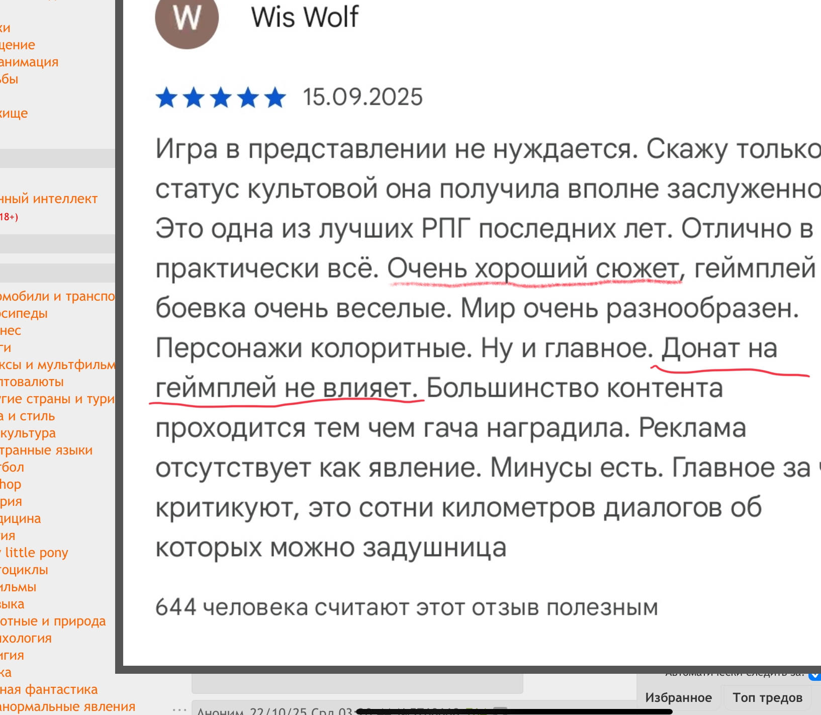 >Когда еще есть сотни тысяч годных книг, которые я еще не читал? А тут не совсем о книгах же речь. Вот в данном случае мы про Геншин. Мне нравится Геншин с его историей, его вселенной и его персонажами. И про него, про Геншин, я бы что-нибудь интересное почитал, даже если это интерпретация выдумки совершенно левого челика. Но в сути своей, какая вообще разница-то? Вот ты говоришь, сотни годных книг, которые ты не читал. Не читал - но уже в годные записал. И я предполагаю, что сделал ты это основываясь именно на критерии популярности. Но по факту какой-нибудь Сапковский ничем не лучше Васи из Твери, который может писать точно также или даже лучше, просто у Васи аудитории нет, ну и пишет он фанфики. Почему бы не почитать выдумки Васи, а не выдумки Анджея? Популярные писатели - это не какие-то сверх-люди с уникальным божьим даром... Более того, даже ты твёрдый ахуенчик можешь написать, если действительно этим заморочишься. И чем ты хуже других популярных авторов из твоей подборки топ-сто книг? Да ничем на самом деле. (Разве что у тебя контент отсутствует, как и мотивация его создавать. Но не об этом речь.)