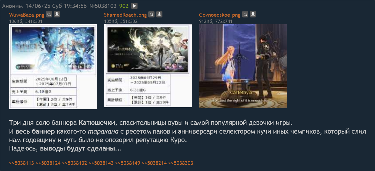 >>5775102 >Мы сюда буквально пришли из пролапса >Раньше всегда говорили, что юшки это база гача игр Я вижу в этом взаимосвязь. А ты? Обиженные и припидзнутые геншинята ноют и вайнят на любую хуйню, то у них камерамен, то еще че то. Им похуй на историю и лор, а вкачестве примера они и идеала они почему-то приводят кумерские гачи с дойками навыкат. И где щас геншин? И именно к этому состоянию геншин привела его всратая фанбаза