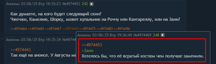 >>5777992 >>5777997 >>5778002 Таких любительниц столько же сколько и тех, кто говорит что вот типа бомж крутой базовичок, надо роллить, а потом на его релизе либо тенролл вкинут либо вообще фулл скип ради тянки. Так и эти, они лучше на хусба потратят. А Кантарелла у большинства женской ца вувы это как красная тряпка для быка вообще