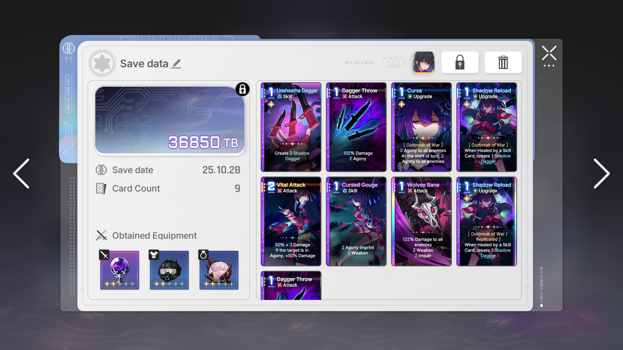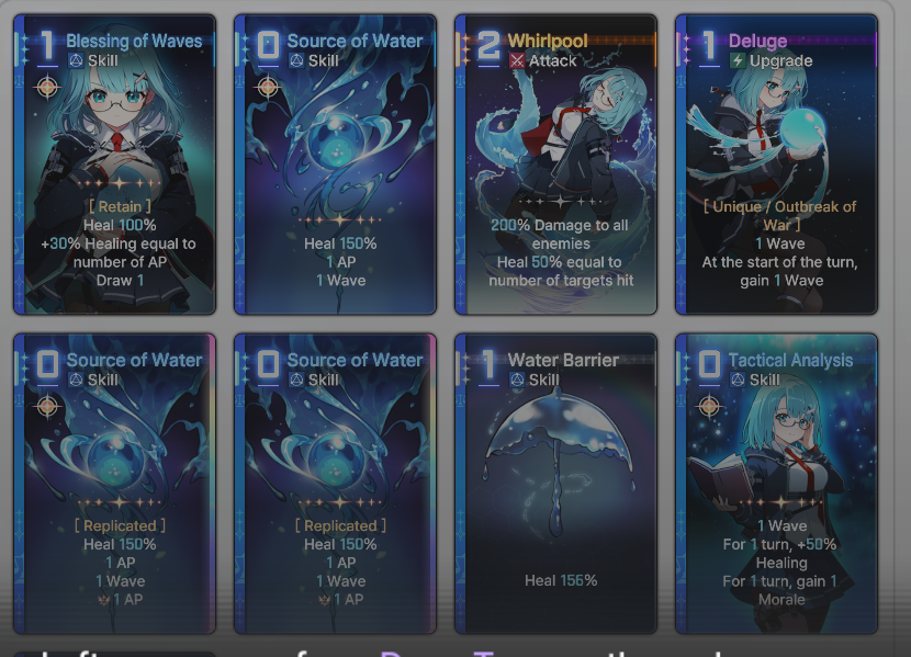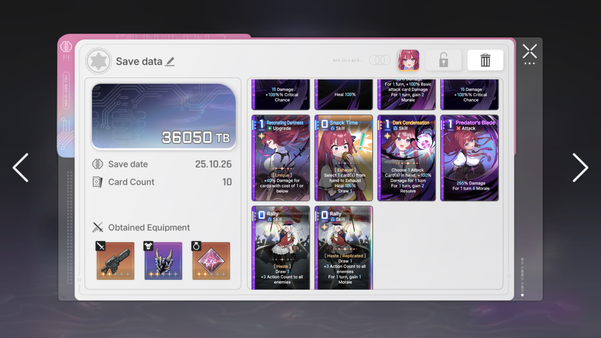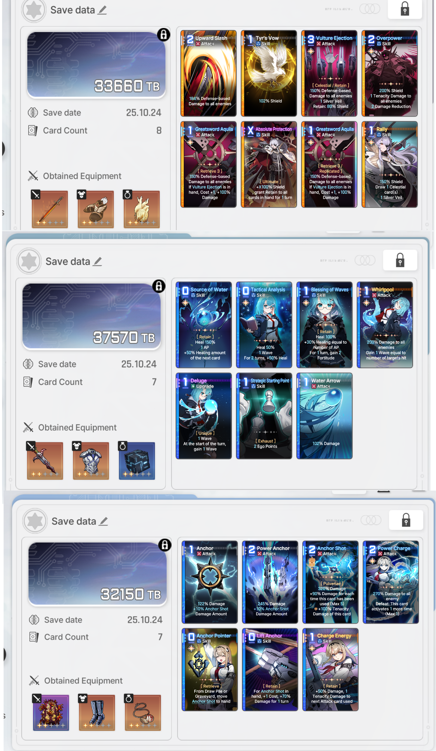 >>5790464 Команды у меня пока собираются из синергии между сейвами а не самими персонажами. Потому что нейтральные карты иногда довольно сильные, вроде 300% урона от защиты + дебафф или однократный добор трех карт или заморозка счетчика действий у противника.