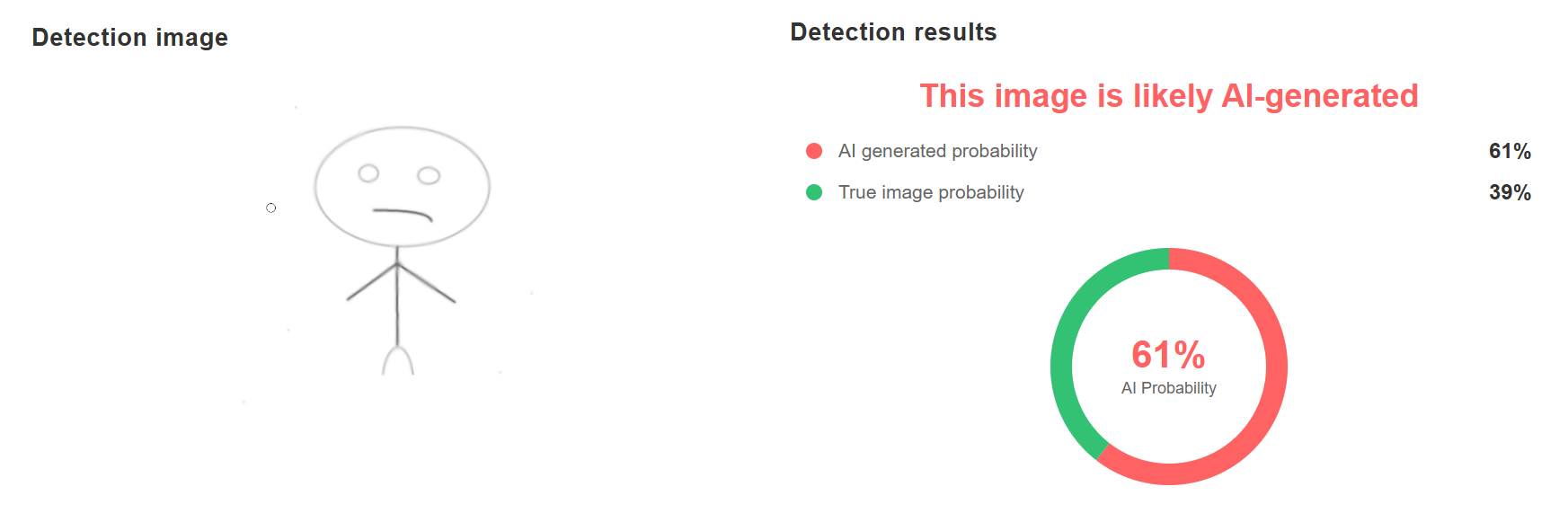 >>5802468 Спорить с тем что тут нейронку использовали я не буду но приносить скрин с рандомного сайта это пиздец убедительное доказательство Я вот стикмена в пеинте нагенерил, детектор не ошибается же