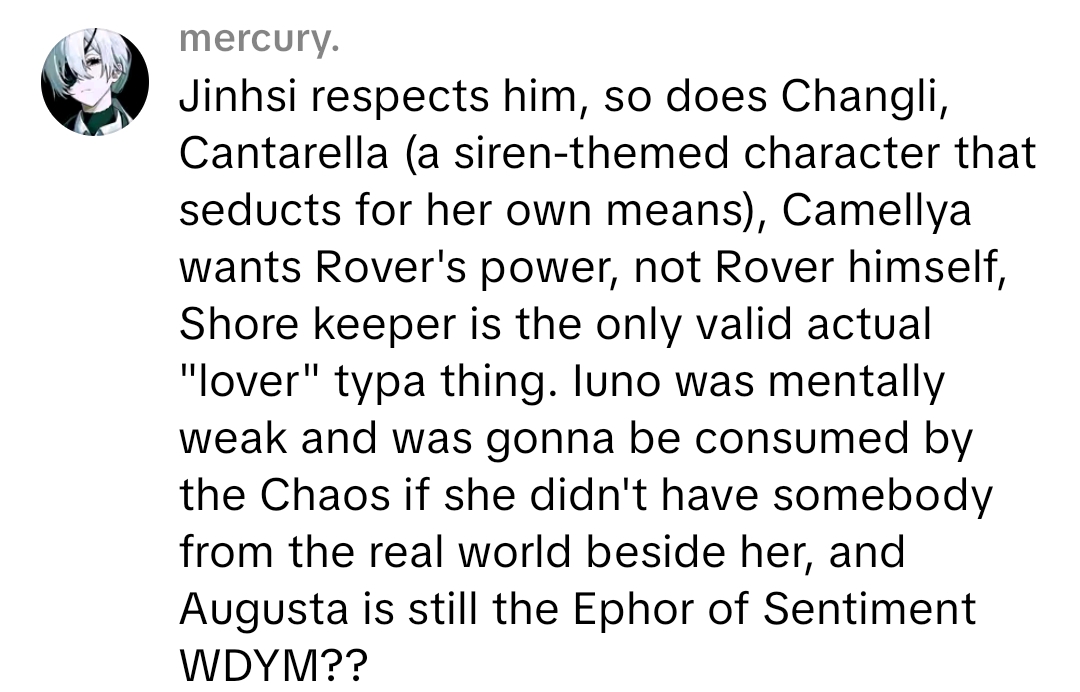 Честно признаться, я с самого начала не понимал, откуда взялся такой хайп вокруг Чисы. Обычная японская школьница, каких полным полно в любом аниме-сеттинге. Но, будучи новичком, я сначала сказал себе, что не надо спешить с выводами, наверное она потом в сюжетке появится, ведь не может быть такого, что ее так шиллят и здесь и на форче. В итоге сюжетку я прошел вплоть до нынешнего патча, а Чиса так и не появилась. То есть весь этот хайп был на основании одной картинки? Не, мне самому нравятся аниме девочки с длинными черными волосами и красными глазами. Но в остальном ее дизайн очень обыденный, нет в нем ничего выдающегося. Хуй знает. Галбрена, например, мне тоже не очень нравится, но в ее случае я легко могу понять, почему она может кому то нравиться: два пистолета, животик, демоническая рука, ручной монстр на поводке, rule of cool и все дела. А здесь-то что?