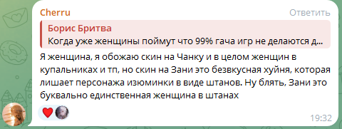 >>5787537 У красноволосой девочки летний скин с трусами, а не с шортами как у чисы например. Да, это конечно скин платный, но всё же, хоть донатер трусы получит. И жопка у нее трясется еще. Ну и там много тян в обтягивающий костюмах, а у нас то августа в халате, то зани в штанах >>5787551 я ни в одну ляо игру не играю