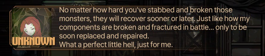 Геймлпейно я игру всё еще ненавижу максимально, полное дерьмище без баланса, без пояснений что от тебя хотят, и даже если делать всё идеально, на 45сп всё еще есть 5% шанса проеба монетки которая отправит тебя на рестарт всего трая тк вся боевка это ебучий сноубол не в твою пользу, но возможно это субъективщина и просто не в моем вкусе.