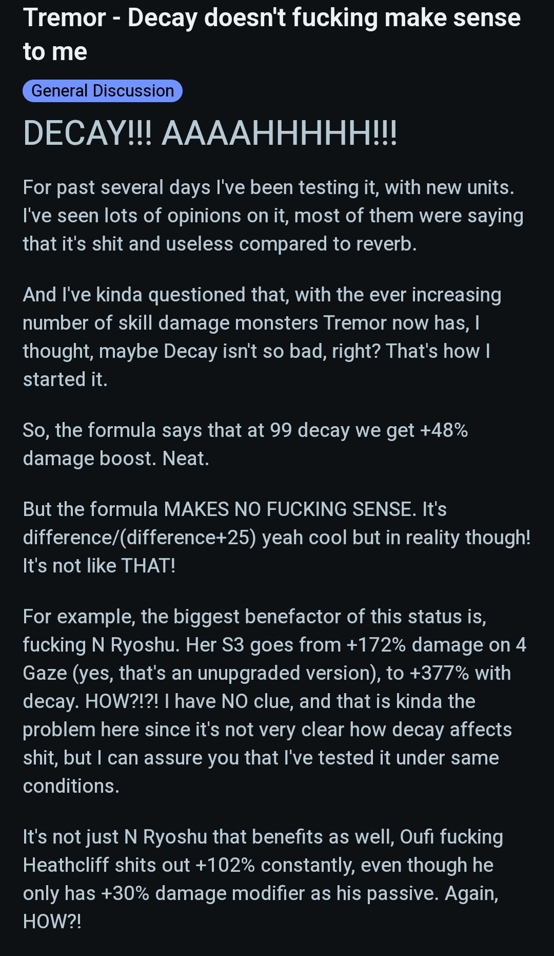 >>5804841 Извини, сейчас посчитал урон с3 при всех кондициях и понял что ошибся, там 6 из 6 скиллов в ките неюзабельный кал, ведь гейдизайнер забыл добавить множители урона, и в итоге с3 наносит меньше урона чем рипспейс релизной вдонки. А так да, реально сильнейшая чарж адйи, где-то на уровне вмерсо, а то и выше, спаситель чаржа SSSS тира.