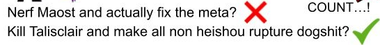 >>5804100 >блять вроде бы не прудвен Додич, ни прудвен, ни глл, ни протыки (кроме нашего) - никогда не имели адекватных тирлистов, тем более что тирлисты имели хоть какой-то смысл до статусоублюдии, со статусоублюдией это шизофрения, за которую в дурку сажают. Манагероублюдия и Волклиф - SSS? ИД не способные держать или даже поддерживать статус, ради дамажного потенциала (с необходимостью активировать кондиши не поддерживаемого статуса), который свободно выдают Мауст, Иерархиус и КоД. Змеи, 15 3 - SS? Не работающее говно требующее несколько костылей, и затычки не продвигающие развитие статуса. Юри фауст - B? Где после коррекции тиров под адекватные это является D тиром. Circumstantial мастхэв в энви, которому практически не существует замены на данный момент.