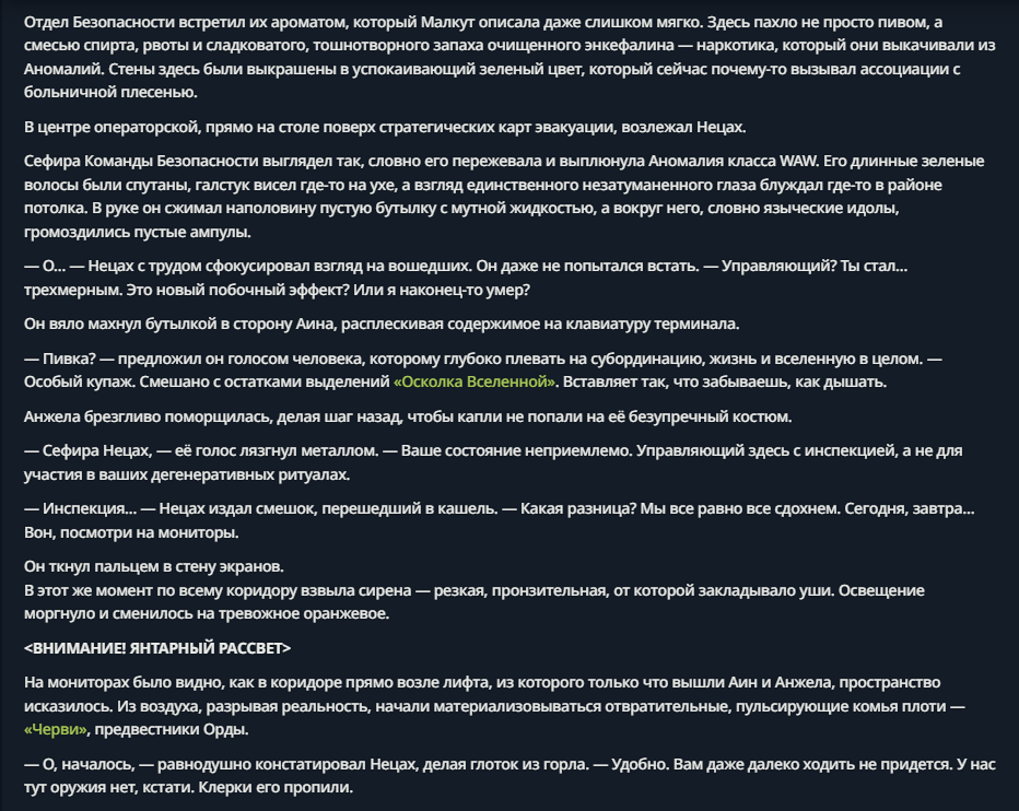 Располагайтесь в своих отделах, доставайте свои книги и заводите Мефистофель, господа. Пожалуйста, обсуждение особо спойлерных тем, таких как [REDACTED] в Лоботомии, [REDACTED] в Библиотеке и данж последней актуальной главы в Лимбусе, прячьте под спойлером, для удобства и комфорта новых агентов. Всем похуй, имейте в виду.