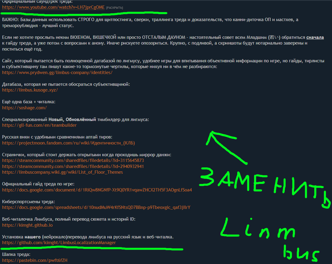 Честная попытка исправить была сделана и оп с бунпуном, поэтому на этот раз прощаю. Объясняю поконкретнее, что запрашивал изменить, может к следующему треду справимся: Нужно объединить дбшки по лигмусу в одну категорию, чтобы убрать лишние описания и переносы. Олсо, лол, описание про вебчиталку с отсутствующей (под описанием) ссылкой на вебчиталку. >inb4 сделай сам пейстбин с тем оп-постом который хочешь видеть