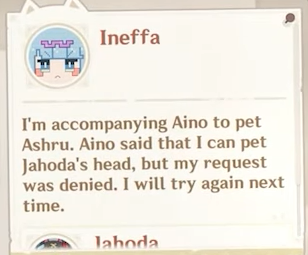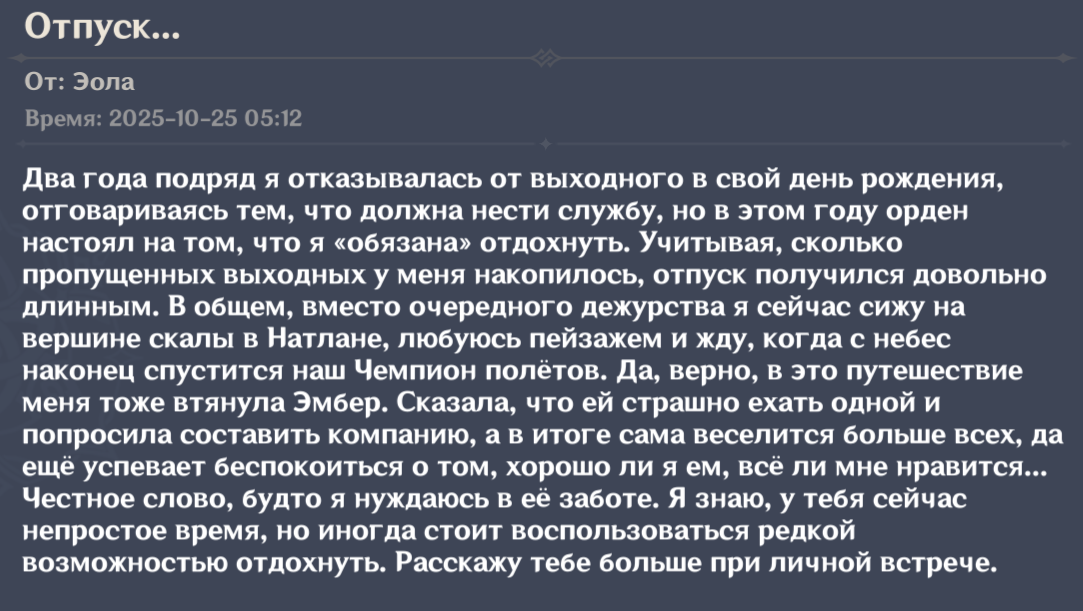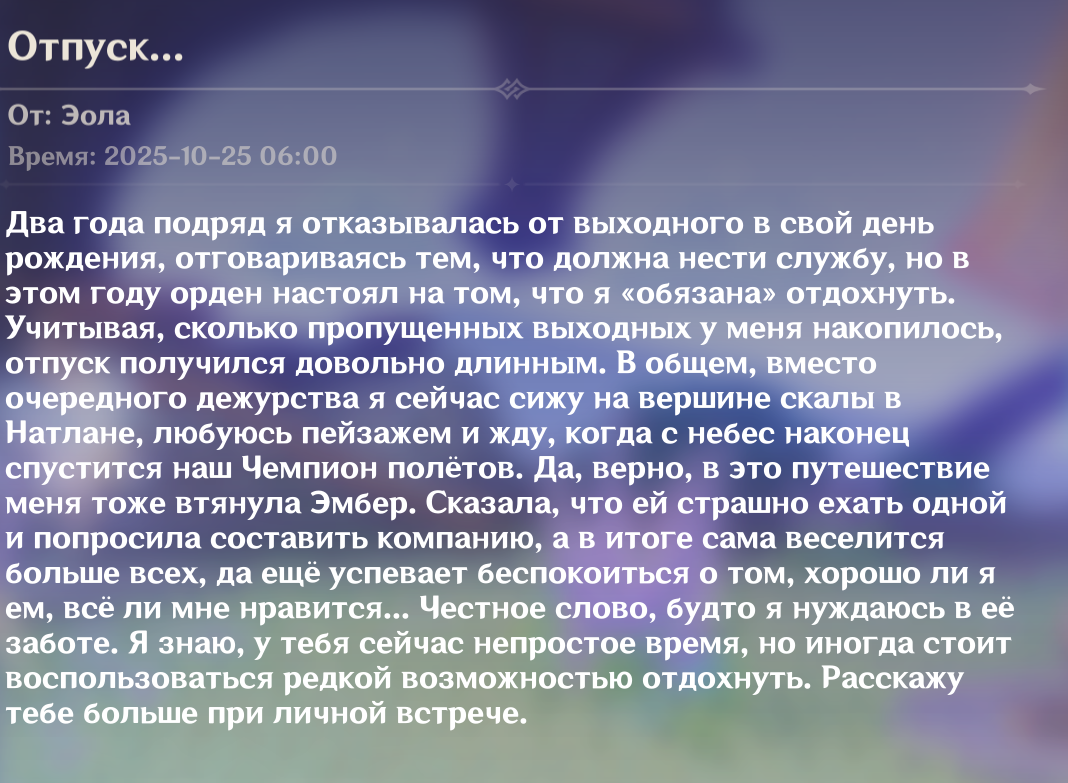 🎁 «Капитан Эола... С днём рождения! Эти туманные цветки я собрал для вас... Я слышал, их порошок хорош в уходе за костяным свистком! Так что...» 📝 «Спасибо, очень мило с твоей стороны. Но не забывай о своих ежедневных обязанностях». «Есть!» 🐇 Торт в форме Барона Зайчика и Додоко... Наверное, вы испекли его вместе с Эмбер и Кли? Так вот почему в прошлый раз за ужином Эмбер всё допытывалась, какие у меня любимые тортики. 🙏 Пора загадывать желание? Да нет, зачем... Эм, Кли, не смотри на меня такими жалобными глазами... Ладно, ладно, если обязательно нужно что-то загадать... В следующий раз, когда соберётесь печь торт вместе, возьмите и меня с собой?
