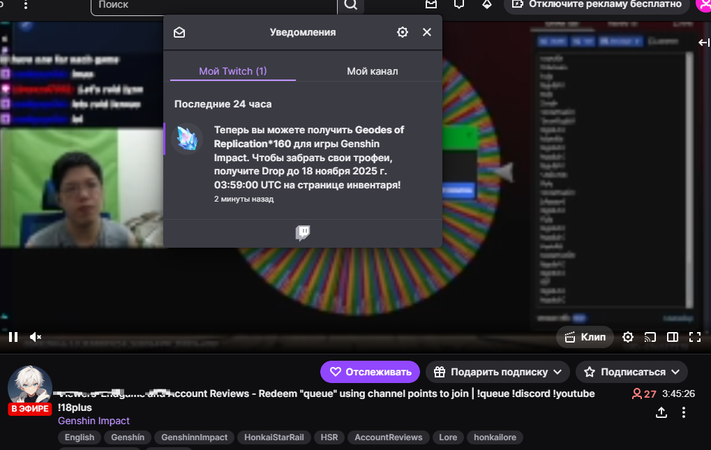 >>5791175 Это твич дропсы. Заходишь сюда https://www.twitch.tv/drops/campaigns, пролистываешь до геншина, там связываешь свои геншин и твич-аккаунты. После этого ставишь любой геншино-стрим на полтора часа на фоне и получаешь гемы и остальное.