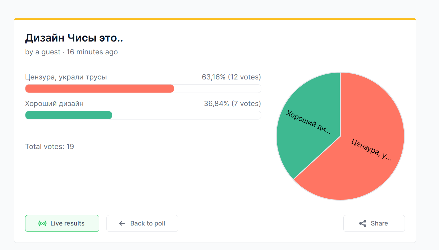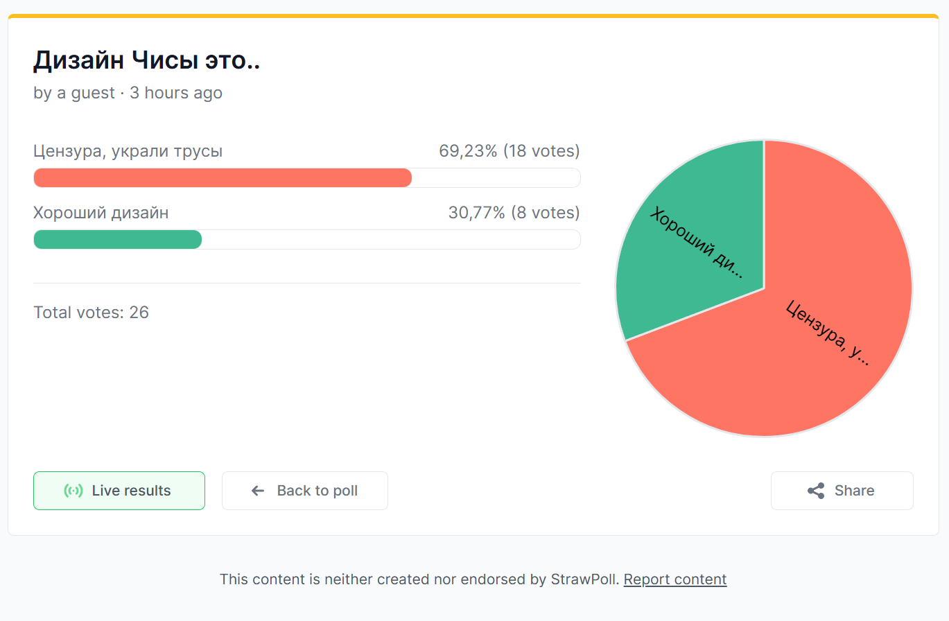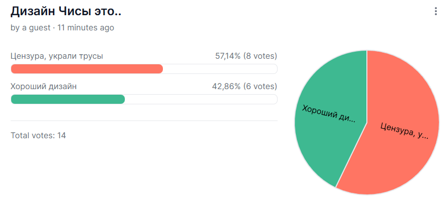 >>5794500 >Можете самые свежие результаты опроса скинуть картинкой, а то у меня не открывается >Интересно посмотреть реально набег одного семена или что происходит 18 (цензура) против 8 (всё хорошо) Так что сразу понятно, как считают реальные тредовички (которые ещё с релиза роллят на сисекписек и смеются над панталонами в г), и как считают 3.5 семёна-залетухи и паймоны.