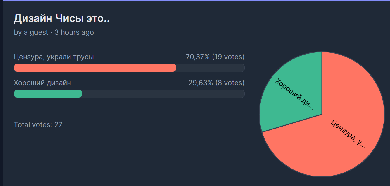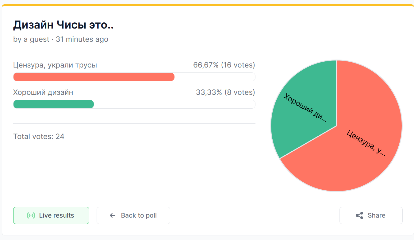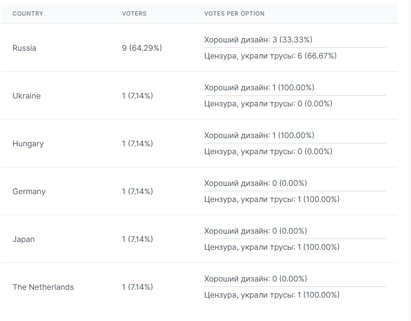 Голосовалка бы решила этот вопрос раз и навсегда увидели бы как из Голландии голосуют что трусы норм и цензуры нет, но дебичи так и будут набрасывать или защищать барина