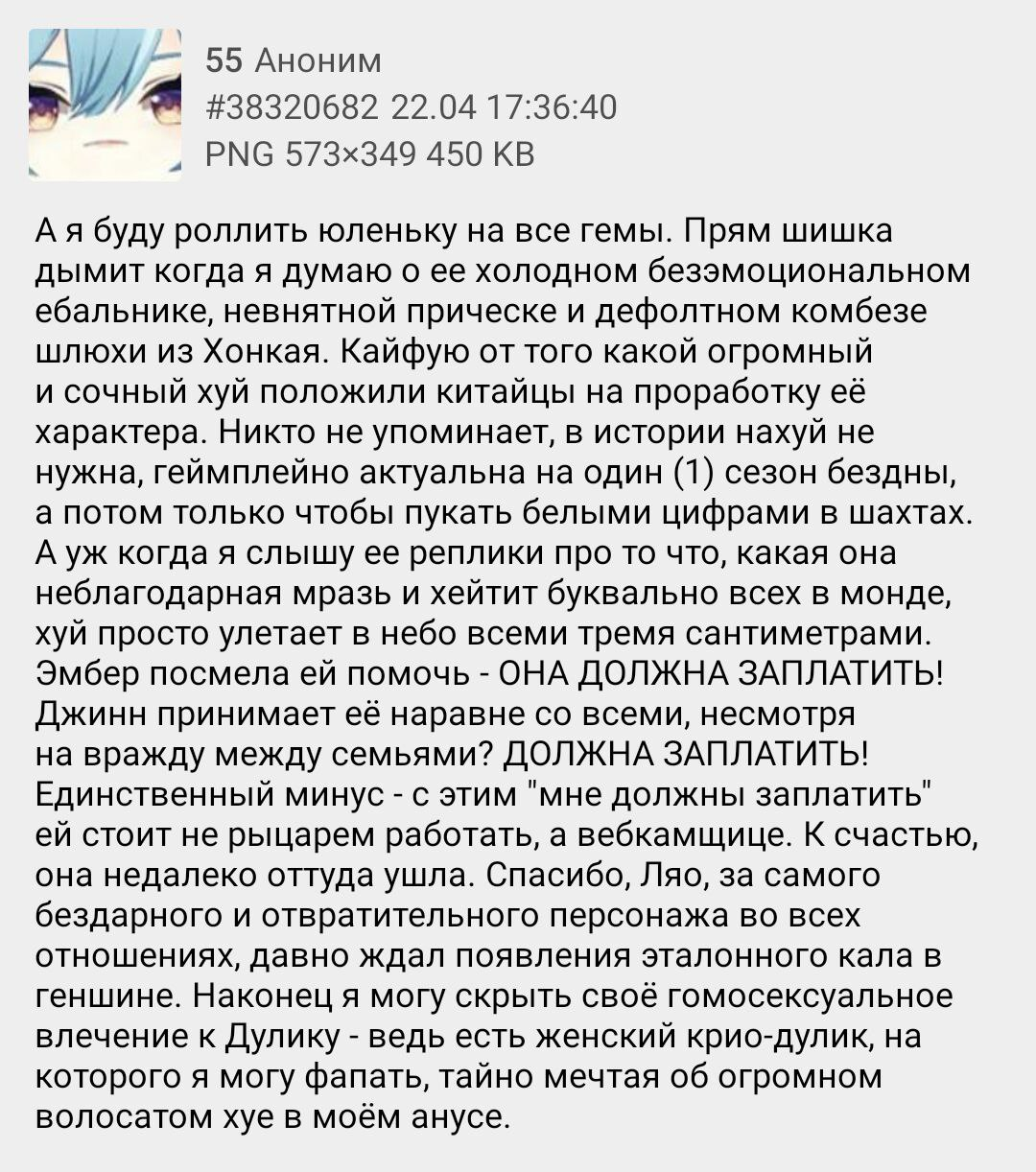 У вас есть ровно 1 минута с момента прочтения этого поста чтобы заплатить самую сексуальную картинку по геншину которая у вас есть, иначе вы будете проигрывать все 50/50 и вытаскивать персов только со 180 крутки в ближайшие полгода