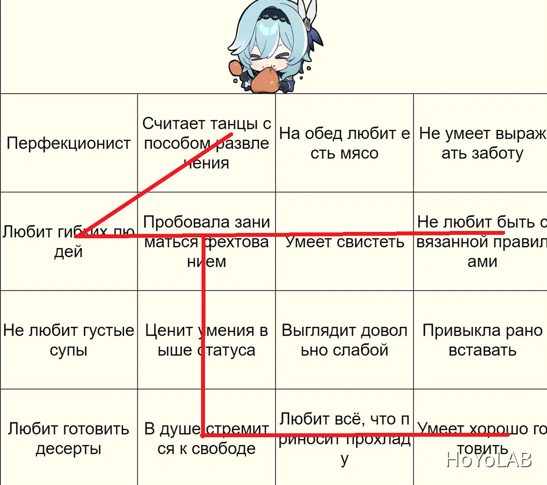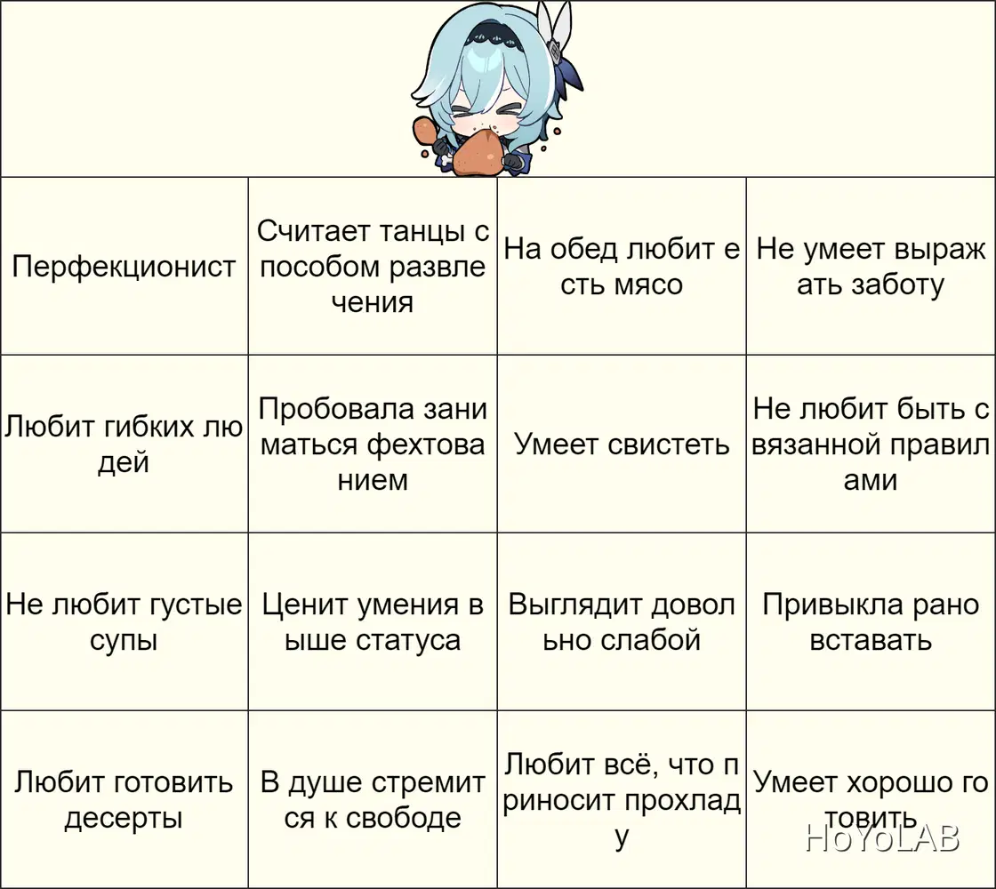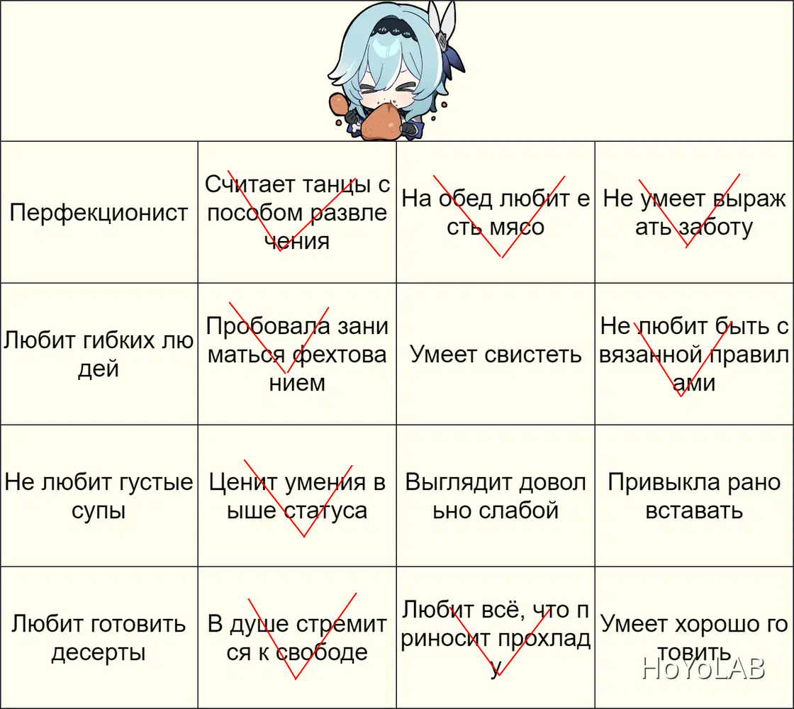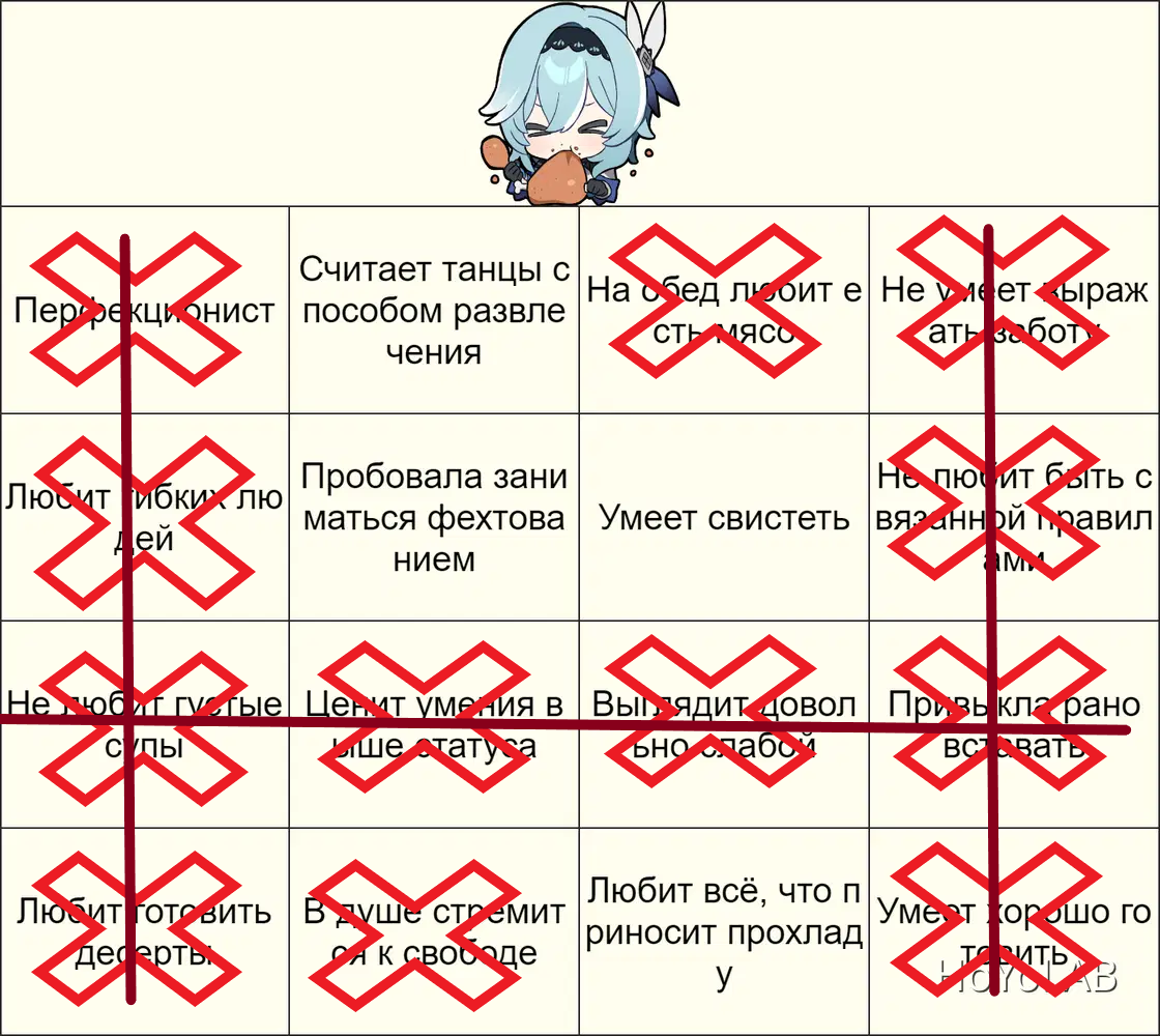 Правила: 1. Пустые поля на изображении заполнены разными характеристиками, так или иначе связанными с Эолой. 2. Отмечайте характеристику, если вам кажется, что она вам подходит! Закрашенные клетки, выстроенные в линию, покажут лучшего кандидата на должность заместителя Эолы!