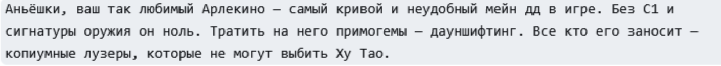 Аньёшки, ваш так любимый Арлекино — самый кривой и неудобный мейн дд в игре. Без С1 и сигнатуры оружия он ноль. Тратить на него примогемы — дауншифтинг. Все кто его заносит — копиумные лузеры, которые не могут выбить Ху Тао.