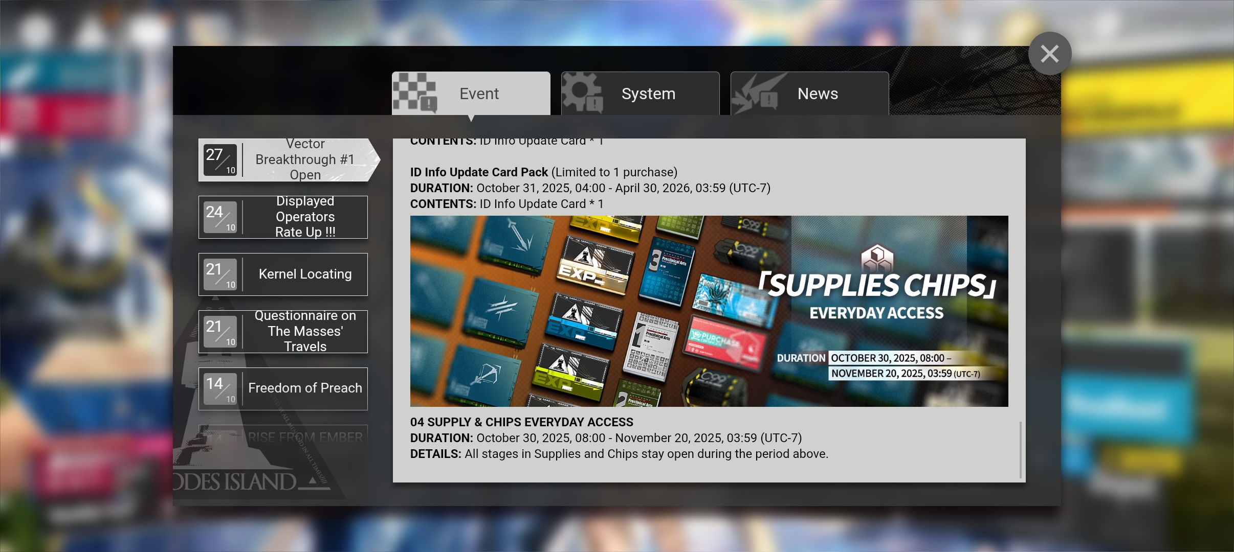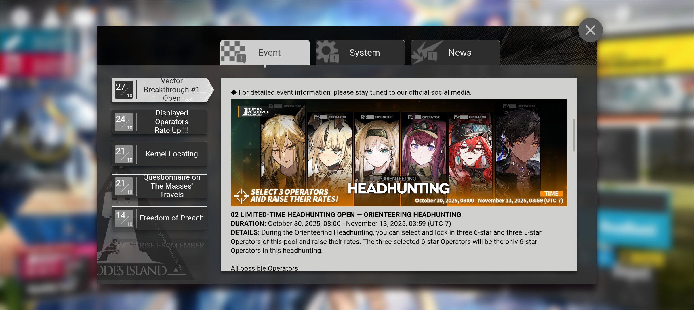 В честь этого ивента с 14 по 28 октября в игре ЛИМИТНЫЙ баннер «Freedom of Preach» 6★ — Exusiai the New Covenant (Лимитная) / Lemuen 6★ — Wiš'adel (лимитная) / Virtuosa / Muelsyse — (отдельный офф-рейтап для прошлых лимиток) 6★ — W / Rosmontis / Skadi the Corrupted Heart / Nearl the Radiant Knight/ Specter the Unchained / Texas the Omertosa — (лимитки, которых можно выбить, но они делят дроп-рейт со всеми остальными офф-рейтап 6★ операми) 5★ — Gracebearer