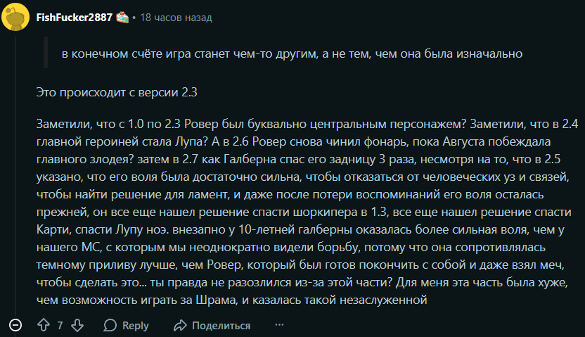 >>5803304 Я только зашёл глянуть, нет ли каких нибудь сливов относительно тех, кто ещё хоть как то мне интересен. Даже и мыслей не было там что то писать, тем более про вуву. А там вот такую чушь люди пишут, и это не просто одно сообщение, это ветка, которую заметил во время быстрого скролла треда. Я сам, наверное, ~2,5-3 года с релиза в каждом фидбеке им об этом писал (на самом деле много о чём писал). До тех пор, как не перестал писать фидбеки, года 2,5-3 назад, поняв, что им просто похуй, вообще. Из-за этого, тут ни на что не надеялся, и охуел на максималках, когда, то, о чём я писал, реализовывалось или исправлялось, в т.ч. хотфиксами на старте игры.
