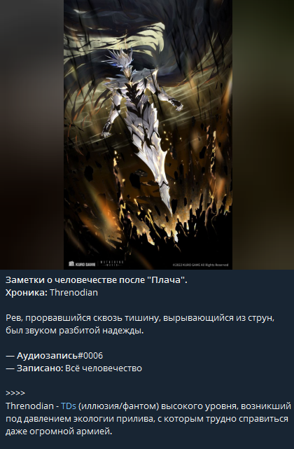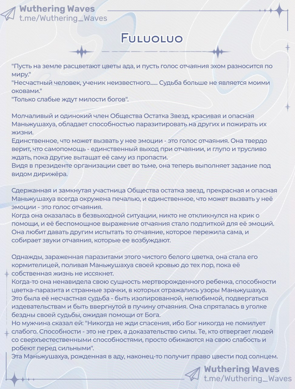 >>5800084 Насчет скрипки забавно, кстати, было. Фролова известна тем, что публиковала Элегию публично: она считается древнейшим музыкальным произведением о котором ничего неизвестно (ни автора, ни места происхождения), но при этом она чудовищно популярна. Особенно среди вот прям знаменитых музыкантов и меломанов. В том числе тем, что каждый человек, увлекшийся ей (в том числе и автора ремарок, которую публиковали в твиттере Куро на анонсе персонажа) в итоге кончал жизнь самоубийством ради попадания в Запределье или исчезал бесследно. Некоторым доставалось приглашение в ее группировку Фракцидус. Вспоминаю сразу, как она забрала реверберации погибших ее подчиненных в Фабрикторуме, не бросила их. Все же Фролова рада приветствовать всех, кто может разделить ее идею о построении Рая за пределами концепции жизни и смерти и не оставляет никого из них позади.