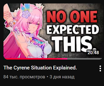 >>5801643 На стриме было заявлено, что в начале будет лорный видос про стелларон хантеров. Скорее всего в середине недели. Потом лорный видос про Кирену, в пятницу такой обычно. Потом будет трейлер Кирены, во вторник после следующий. И потом анимэ из основного сюжета с песней этой. Выйдет в день релиза, но рекомендовано не смотреть до прохождения сюжета, так как это тупо из сюжетки взято.