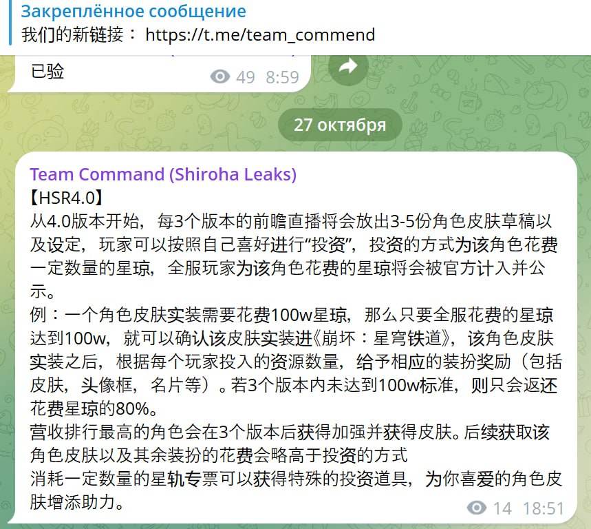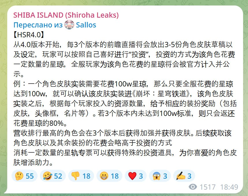 Пример: Если для реализации костюма требуется 1 000 000 звёздного нефрита, то, когда суммарные траты всех игроков достигнут этой отметки, костюм будет подтверждён к добавлению в Honkai: Star Rail