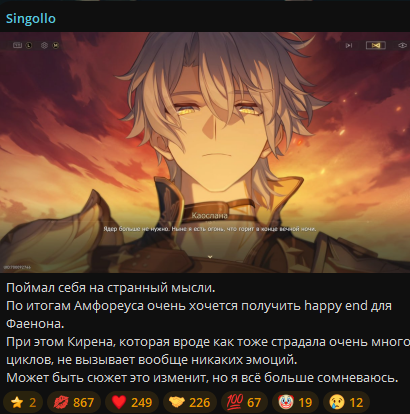 Вообще плавно прихожу к мысли, что здоровые отношения с геншином - это месяц игры и три-четыре месяца отдыха от оной. Благо крутить мету не то, чтобы и нужно, если просто положить болт на эндгейм.