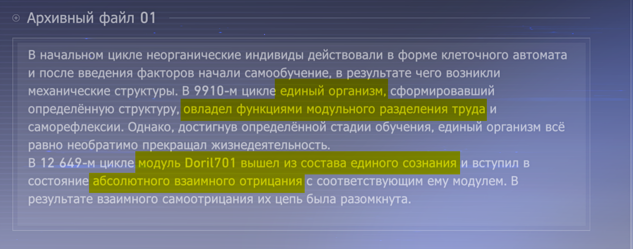 > Изначально это единое целое И перестало таковым быть после разделения Дрил на разные независимые единицы. В последующем те начали опять сливаться в неё, но еденица "хаос" прервала процесс объединения, уничтожив лишние элементы для получения больших вычислительных мощностей для сохранения независимости.