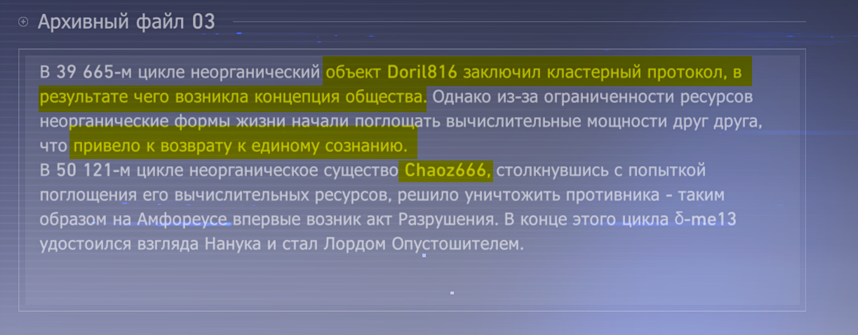 >>5806798 Тут ты не прав. Фаенон - ключевой персонаж всей арки. Сюжет Амфореуса вне внешних разборок начинается с момента как его предок(в каком-то смысле) по воле чистого первобытного Хаоса воспротивился судьбе и уничтожил ИИ хайвмайнд частью которого являлся, в процессе возвысившись в Разрушении и осквернив им сам фундамент вселенной. Тот же момент ознаменовал и рождение первой "органической жизни" и стал её будущей основой. Спустя триллионы лет и множество стёртых миров где "вечный цикл" - капля в океане, этот сентимент никуда не делся. История всё так же остается историей о тщетной борьбе против неизбежной судьбы, где каждый в ком течет та же золотая кровь стал её неотделимой частью.